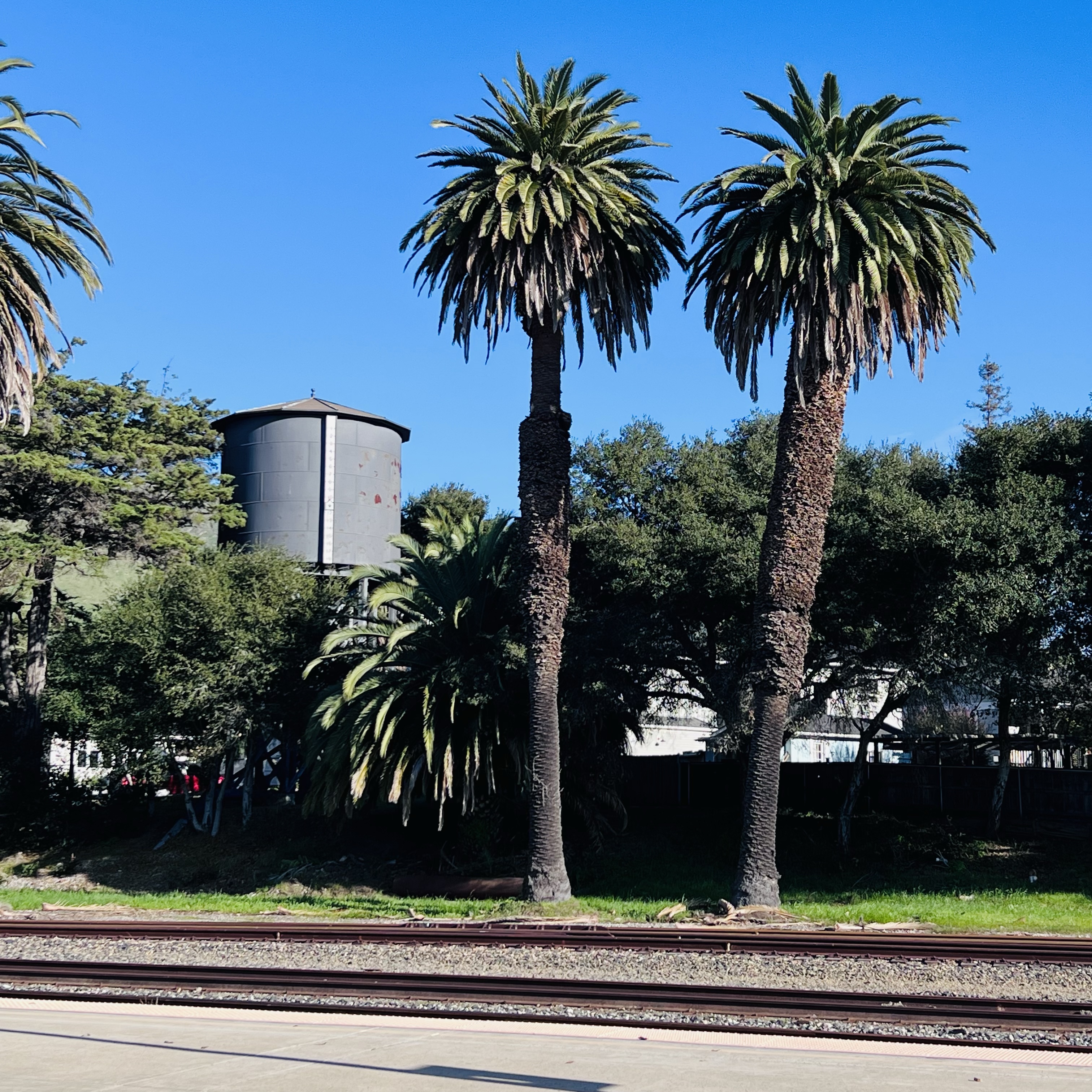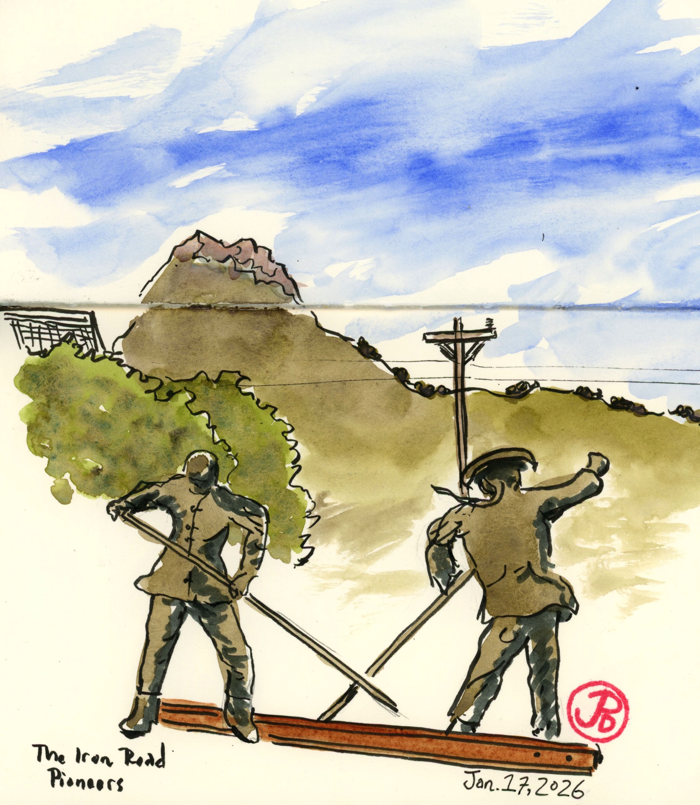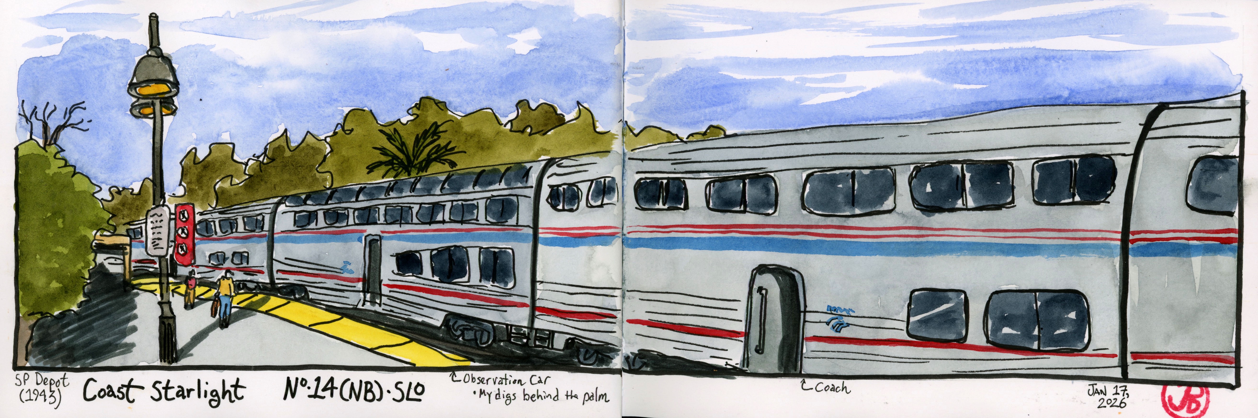 While waiting for the northbound Coast Starlight, I found a bench and sketched the statues near the station called the Iron Road Pioneers, with Bishop Peak in the background.