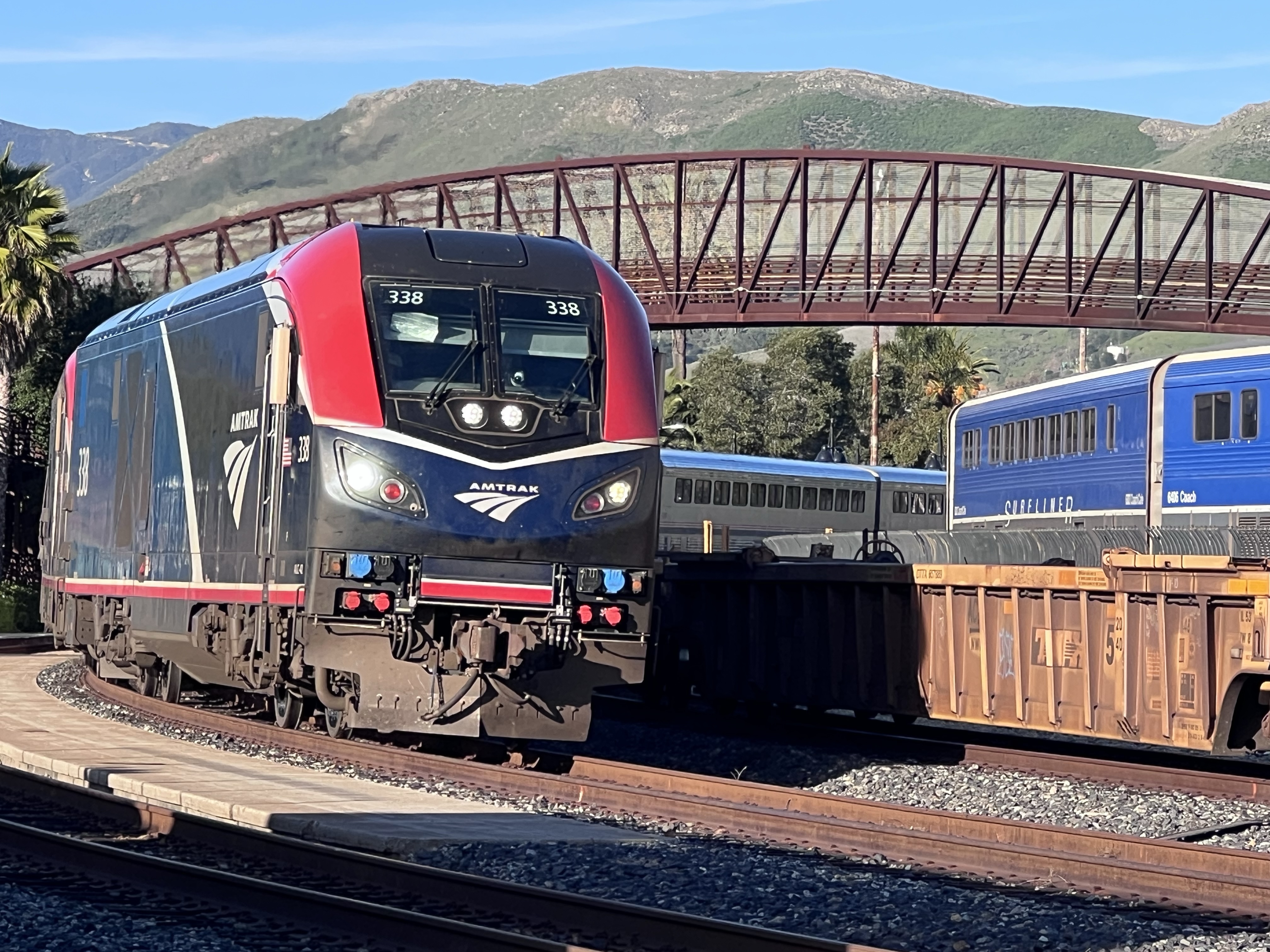 Train 11 heading towards Los Angeles with the AMTRAK’s new motive power, Seimens Charger on point. On the right is the Surfrider train on a side track.