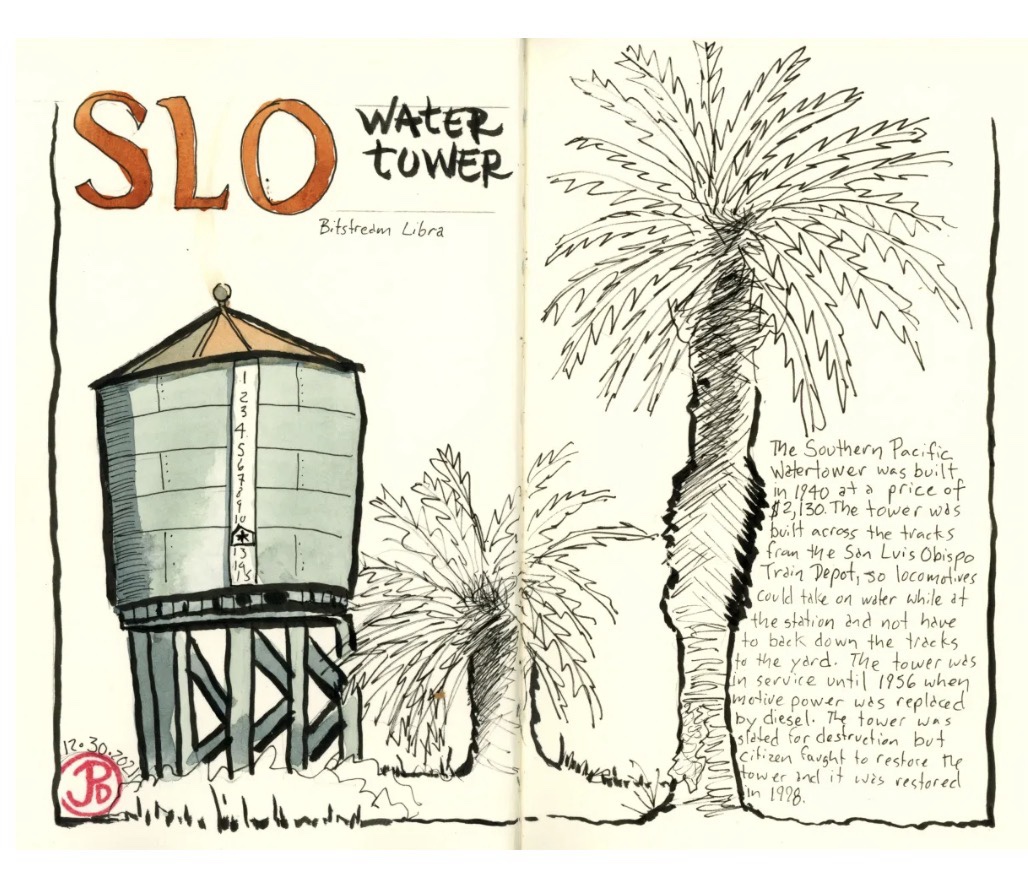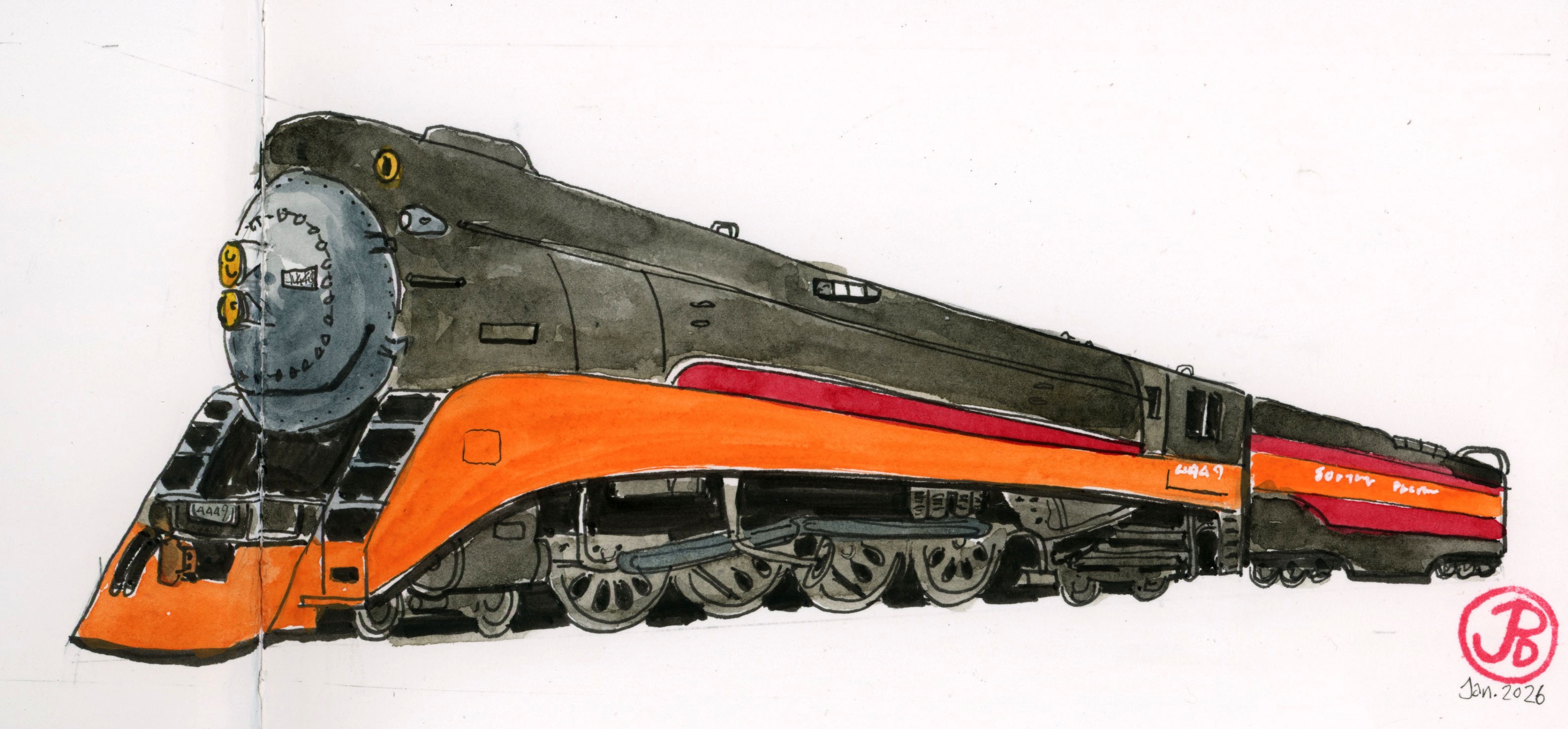 My sketch of one of the most famous steam locomotives in the world, Southern Pacific’s GS-4 No. 4449. This has been deemed “the most beautiful passenger train in the world” and SLO was one of her stops.