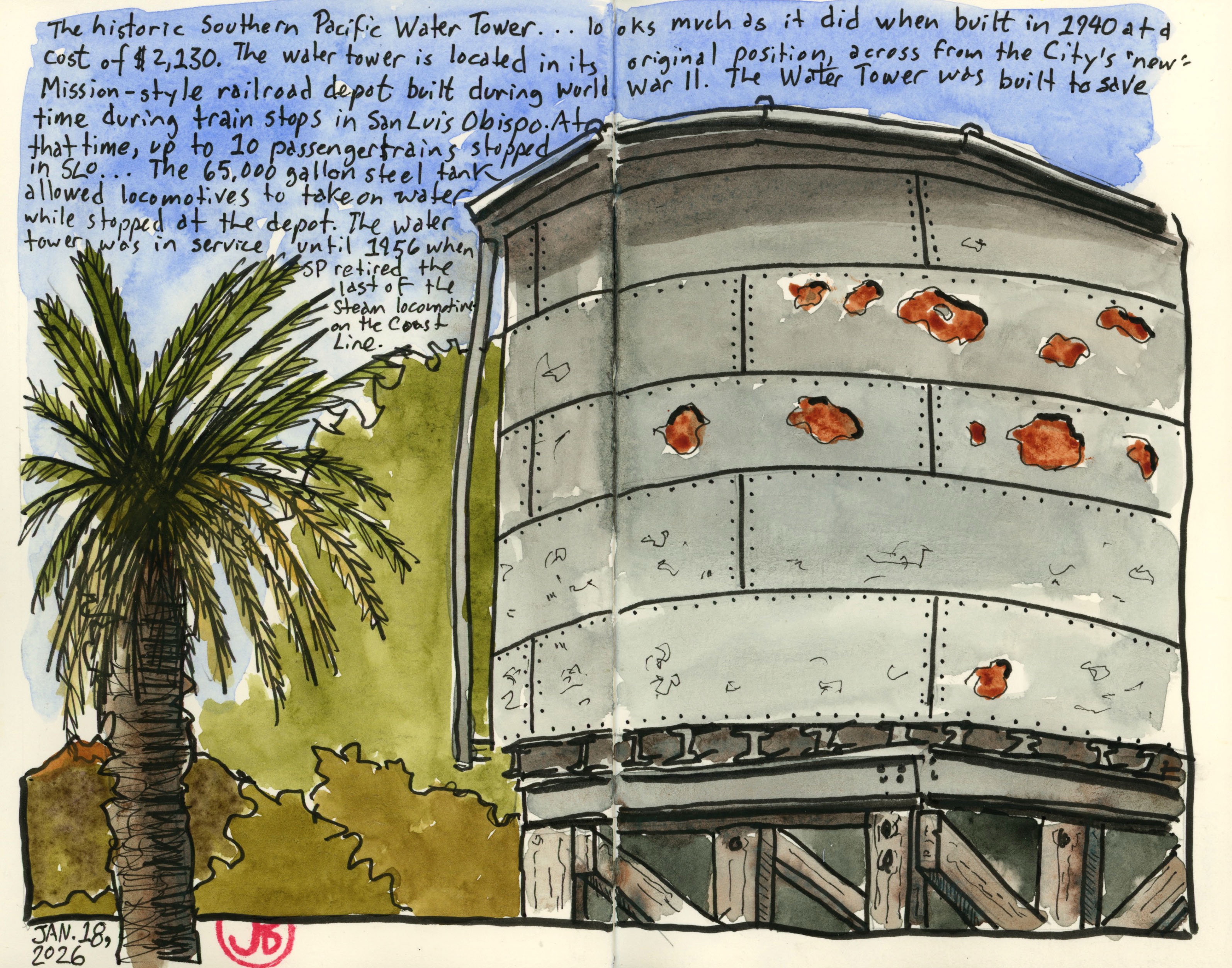 My plan was to sketch the northbound Train 14 at SLO station. In the age of steam, the Coast Daylight (SF to LA) stopped for only three minutes at San Luis Obispo in order to keep to its timetable.