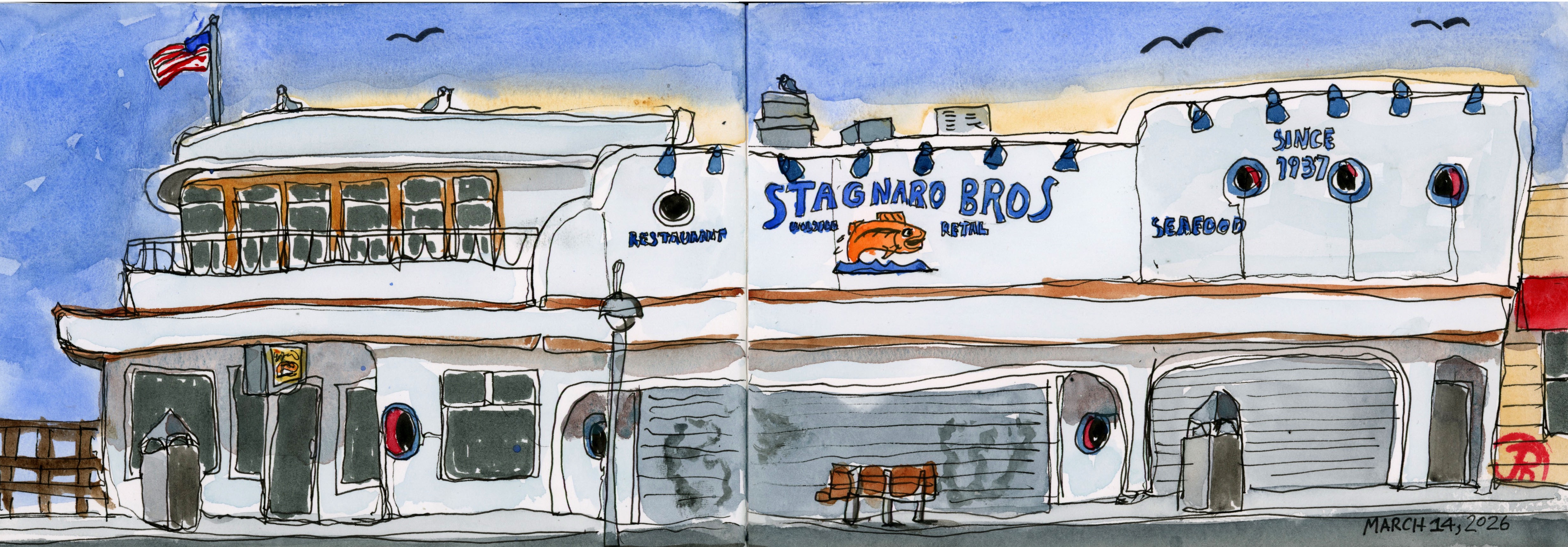 Before me was a long building that looked more like a seagoing vessel than a restaurant. My panoramic sketchbook was open and I started my continuous line sketch as the day was coming to life.