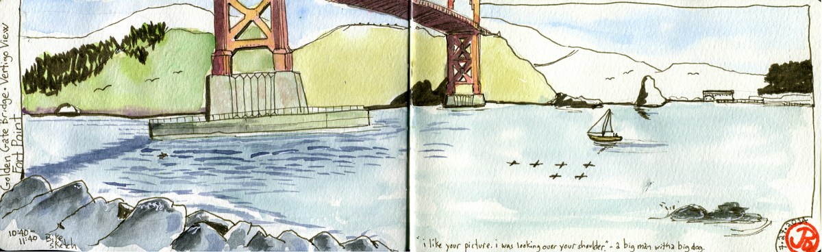 The Golden Gate Bridge is perhaps the most photographed bridge in the world, so for my first post, I add to the endless body of images of this California icon. Why? If you want to overcome your fear of sketching in public, first choose a Sunday morning in July and then select a slightly unorthodox view of one of the biggest tourist attractions in California: the Golden Gate Bridge (from Fort Point), made famous in Hitchcock’s Vertigo. I can just imagine seeing James Stewart pulling a near lifeless Kim Novak from the frigid waters below the arching span. But I can also hear the rumble of yet another tour bus that deposits it’s load of tourists, a school group in this case, all rushing to the rusted chain barrier, stopping and photographing the bridge (yet again) with camera or phone and then posing for a group photo as the tour guide barks out orders in a Monty Pythonesque voice (don’t ask, I just live here). All the while the sketcher tries to fain obliviousness to the horde that are almost perched on his left shoulder. Maybe they are even photographing me. Everyone becomes part of the scenery and spectacle in San Francisco. It was much more difficult to fain obliviousness when the big man with his big dog passed by. The big dog looks to be the breed that you see on local evening newscasts, you know, the dog that has the noose around it’s neck as three animal control officers try to wrestle the beast into the back of a wagon. Yes that type of dog. And his massive head was inches from my face!