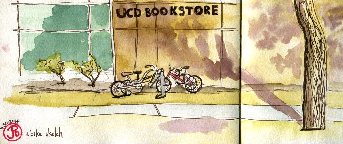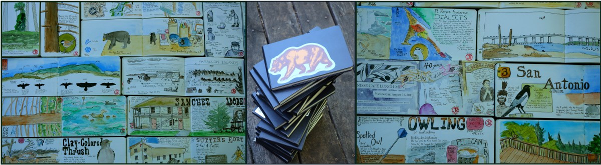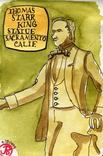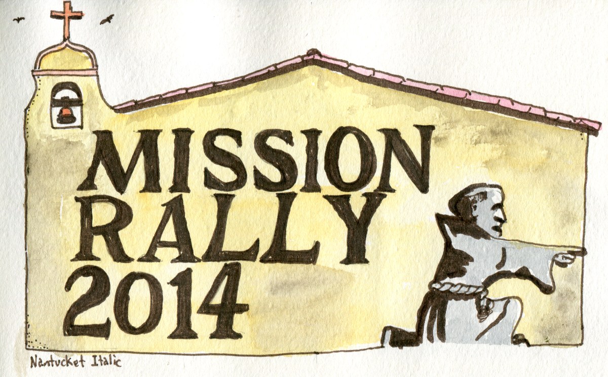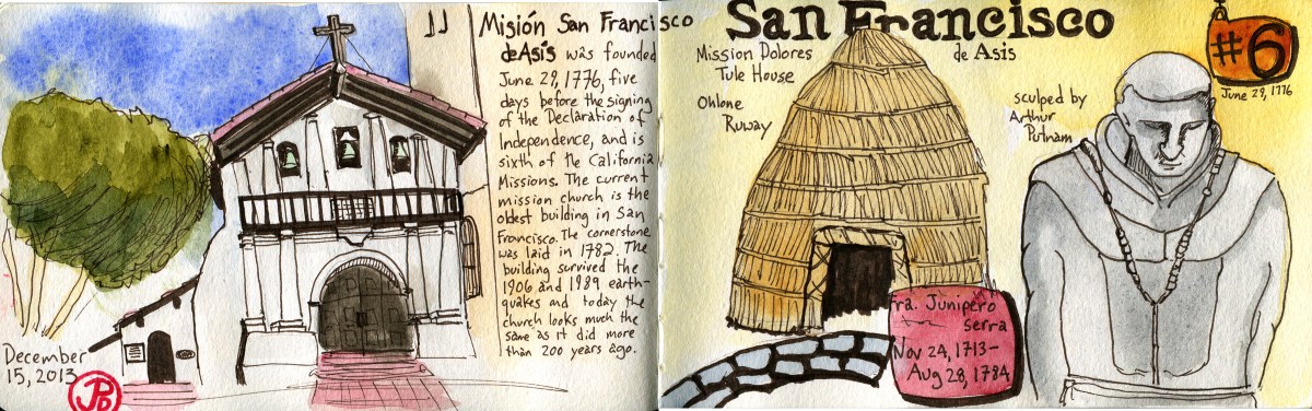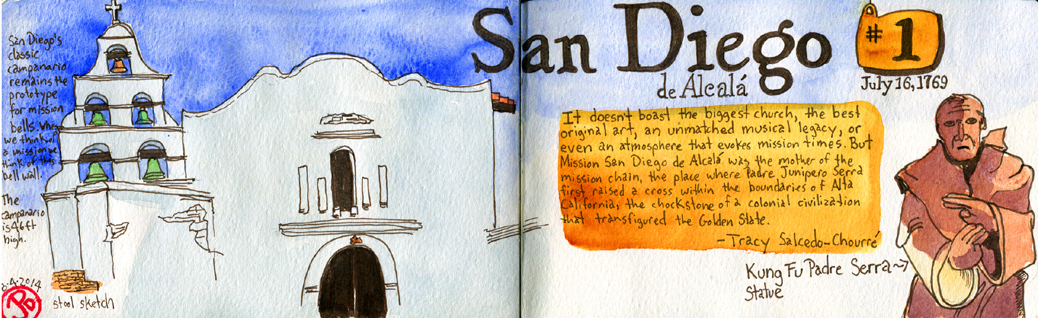 This spread was the last in my Mission Rally.The final field sketch was of the rather creepy statue of Father Serra walking with his arm around a scantily clad native boy.