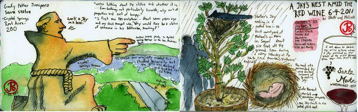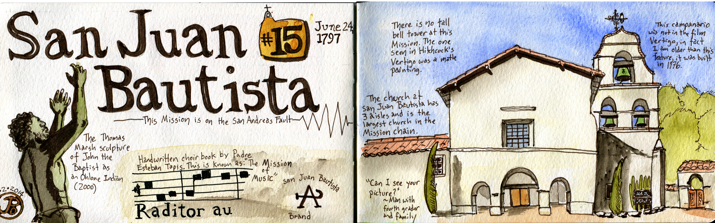 This spread was the last in my Mission Rally.The final field sketch was of the rather creepy statue of Father Serra walking with his arm around a scantily clad native boy.