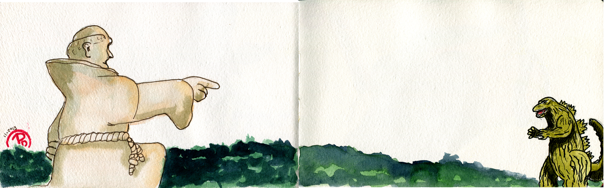 A bit of whimsy from 2013. Godzilla is about to meet his match when he faces off with Father Serra.