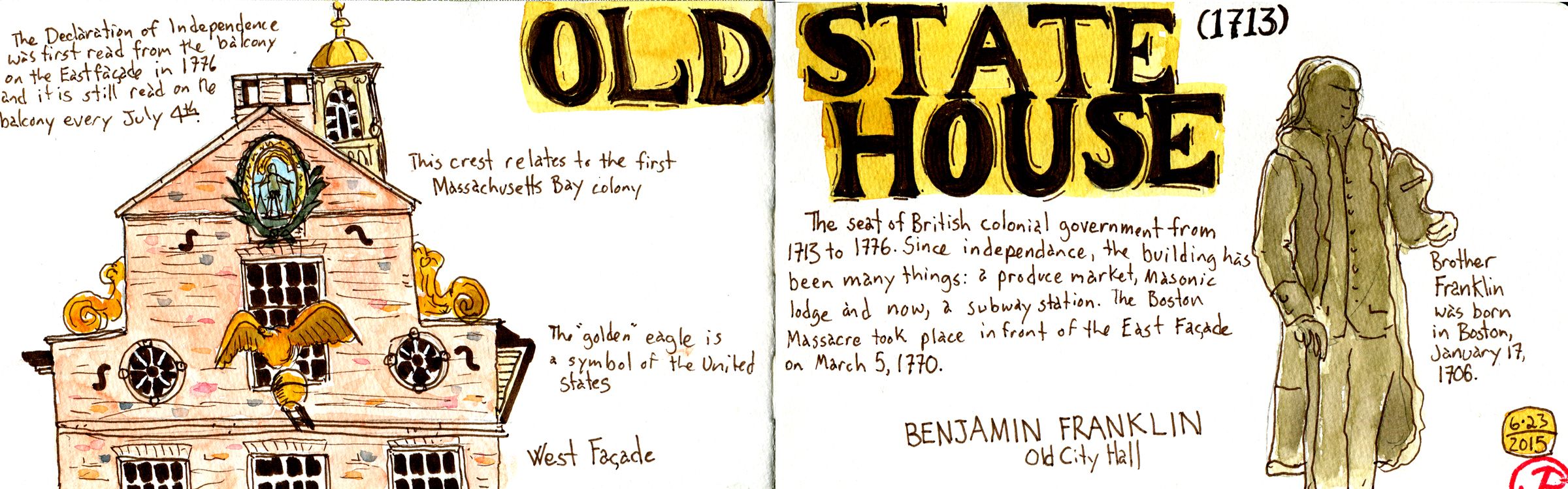 On another morning I walked down Washington Street to sketch Boston’s oldest standing public building, the Old State House (1713). In my mind, no other building represents the contrast of old and new that this brick building that is now dwarfed by glassy skyscrapers. It was the center of British government and on March 7, 1770, the Boston Massacre occurred in front of the east facade. The Declaration of Independence was first read in Boston from the balcony of the Old State House on July 18, 1776. This early American history is contrasted by the subway station in the basement on the eastern side of the building. The Declaration of Independence is still read from the balcony every Fourth of July.