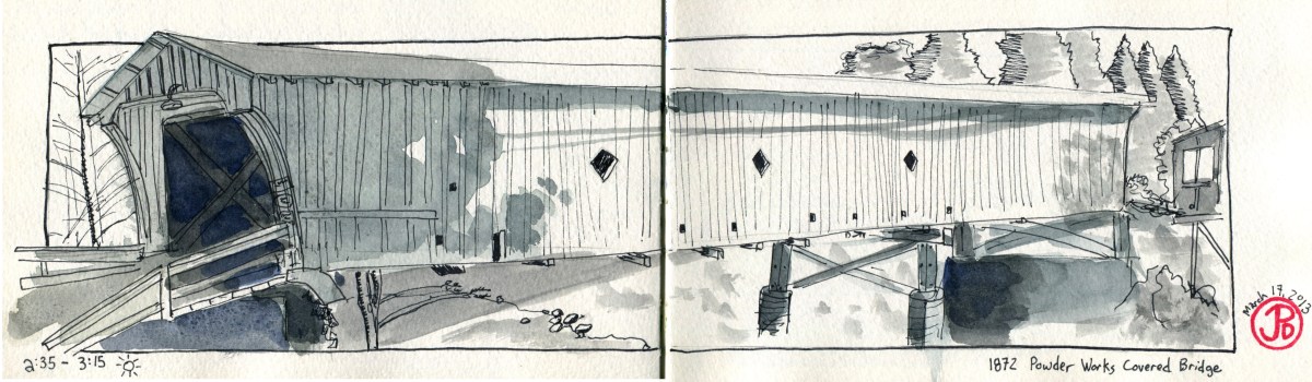 I have been familiar covered bridges from an early age. The covered bridge in Paradise Park (featured image), near Santa Cruz, has been the only way to cross the San Lorenzo River without getting wet. This bridge was originally built for the California Power Works which formerly occupied the site. The 180 foot span was built in 1872. Unlike the Bridgeport bridge, this bridge is open to foot and automobile traffic making it a bridge in continual use for 143 years.