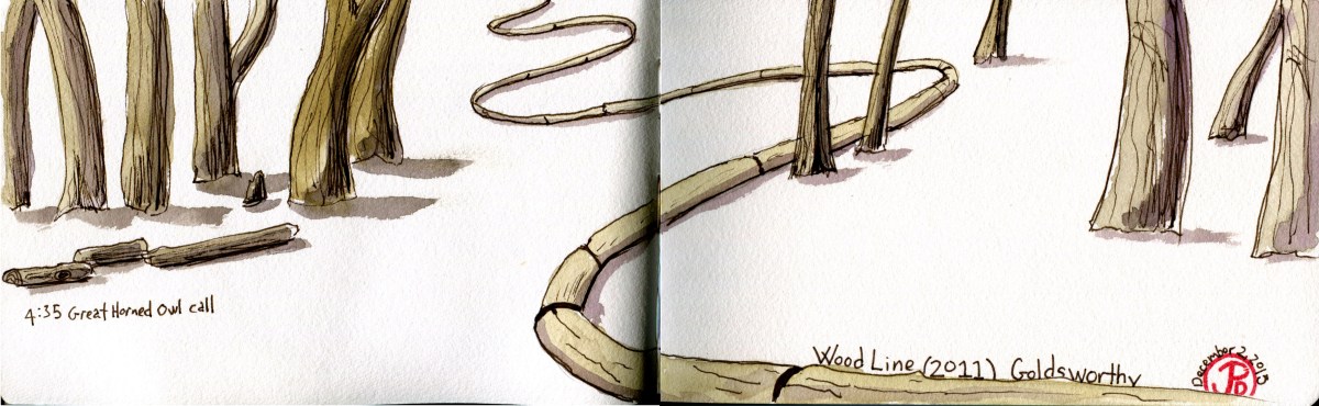 I set up my camp chair on Family Beach and using the waters of the chilly South Yuba River, I painted the span. The beach was lacking families on this December morning and an American dipper kept me company as this amazing aquatic songbird dove in the wintery rapids of the river as if it were a summer’s day. The dipper provided entertain while I waited for my washes to dry. I even included Muir’s favorite bird in the sketch.