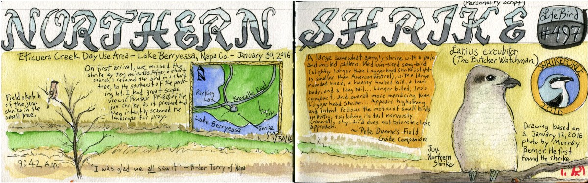 This spread was about my experience watching California condors at Grimes Point in Big Sur. it was a magical day with about ten condor perched by Highway One. The drawing is based on a photograph that I took and the condor’s massive wingspan seems to span the coastal hills in the background. I wrote a poem about the condor, included underneath it’s wings.