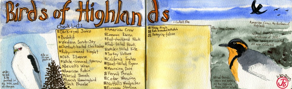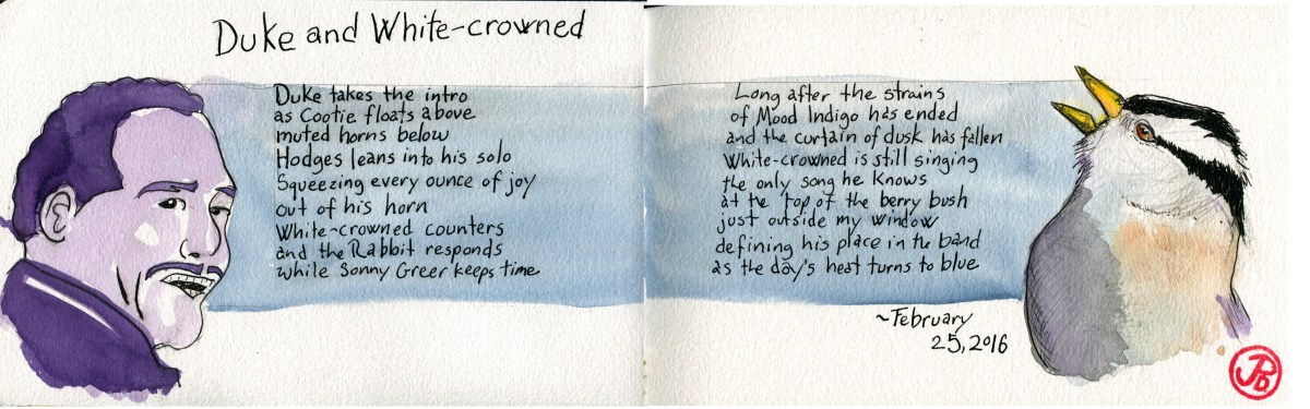 One afternoon I was listening to one of my father’s Duke Ellington CDs, a CD that I had gotten him for Christmas a while ago. My father loved big bands and he saw Ellington, Basie, and Ella as well as west coast greats Brubeck, Cal Tjader, and Vince Guaraldi. It was one of those beautiful February afternoons where the trees have blossomed early and the White-crowned sparrows were singing at the tops of trees to mark out their patch. It seemed to me, and the sparrows, that it was a spring day. As I was listening to Ellington the white-crown in the backyard seemed to be singing with the band so I wrote a poem about it and created a spread.