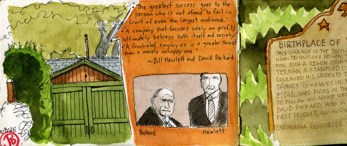 While sketching the house I reflected how much it resembled the house where I grew up, just 3.6 miles away, which was a two story track house in Sunnyvale, also on the land of an apricot orchard. I attended the rival high school to Homestead High, where the two Steve’s graduated. In a 1995 interview Jobs commented on growing up in the area: