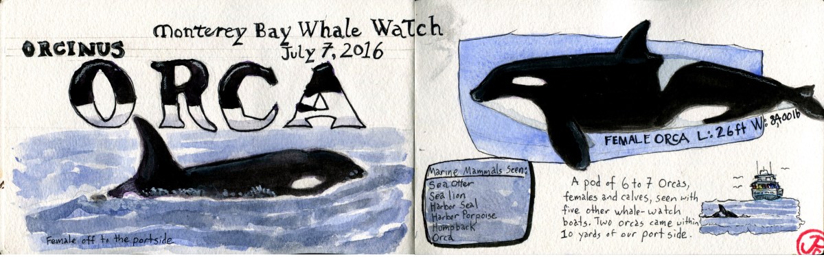 Recently more and more orcas have been sited in Monterey Bay. It was previously thought that they appeared during grey whale migration to prey on mothers with their calf as they headed north from their birthing lagoons in Baja California to head to their feeding grounds to the north. But now they can be seen throughout the year.