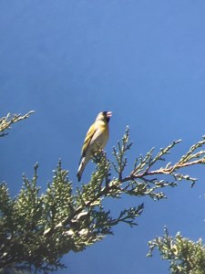 Dickcissel’s photo of the male Lawrence’s goldfinch, singing at the top of a tree in the Deer Creek Campground.