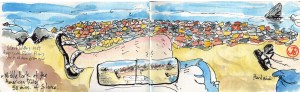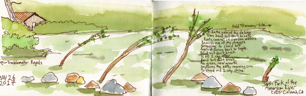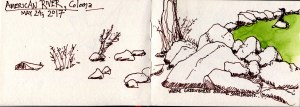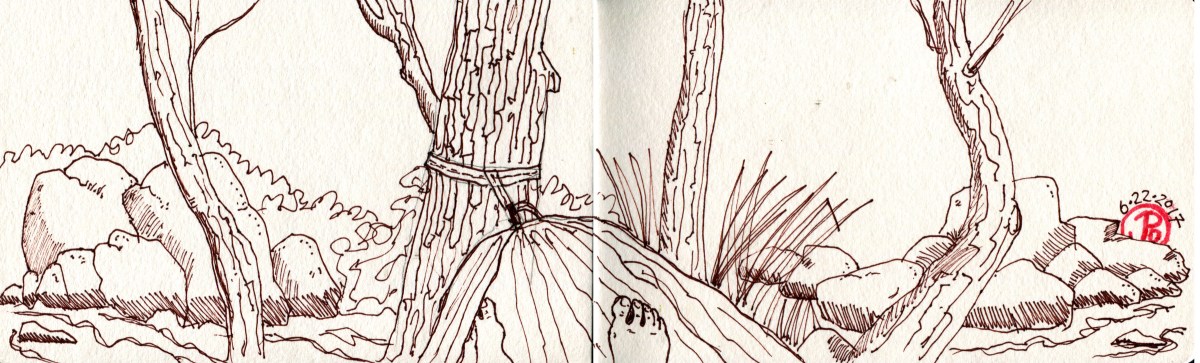 But right now I am content to lay back, the creek flowing underneath, and try to find coolness in the 103 degree afternoons of the foothills. I open my sketchbook and start sketching my feet, the two twin foundations that keeps me upright, even when I’m downright.