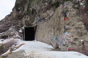The upper China Wall on the right and the entrance to Tunnel #8 looking east along the now abandoned railroad bed.