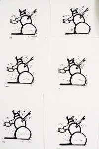 Over the course of a week I sketched out designs for the print, making small changes until I had settled on an image that worked. In the end, the image is a snowman, facing away from the viewer, his head held up, scarf flowing behind, and his arms raised to the sky. The title of this print is “A Prayer”.