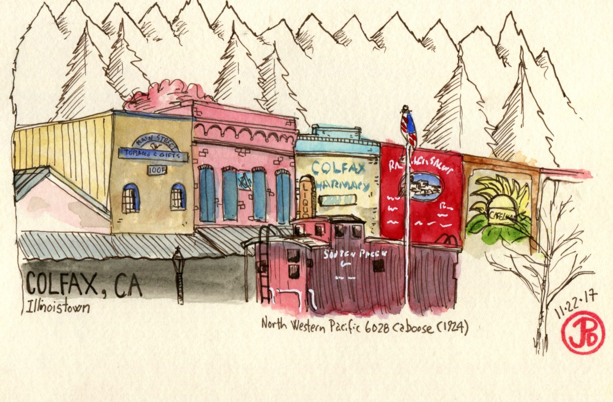The east bound passanger train from Sacramento, worked it’s way up the valley into the station. The California Zephyr was running a little late. I walked over to my car and headed out towards Highway 174 to the Historical Viewpoint for Cape Horn. I waited and down below, the Zephyr passed and soon, on the distant hill, the train worked it’s way up the mountain and started up the grade towards the Cape Horn cut, high above the North Fork of the American River. The cars rounding the horn and disappearing from sight. I returned to the train depot to start working my Colfax sketch.