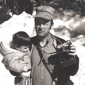 A photograph from the early 1970’s. My father up in the Sierra snow. Me in one hand and his trusty Nikon in the other. He is wearing his ski hat that he wore for many years on the slopes of California: an engineer’s cap with the South Bay Ski Club pin in the middle.