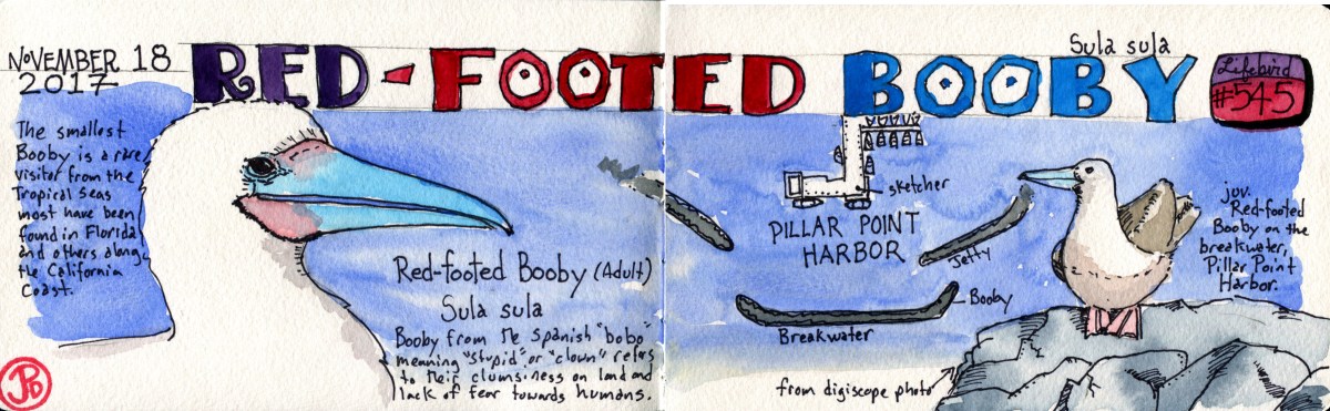 Almost fifteen years later, another booby flew into Pillar Point Harbor. This time it was the smallest species of booby, a native to southern tropical waters , the red-footed booby (Sula sula).