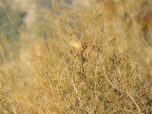 I first hear the rolling-meandering call of a thrasher at 6:41 AM and I rushed to the southwest in search of the singer. But this desert wraith led me on a wild thrasher-case that ended at a dense brush Leaving me gazing into oblivion. Then from my right, I heard another song and I rushed off to the northwest. This time I saw a pale bird with a peachy butt hop to the ground and disappear into a dense thicket. My first, but brief, sighting of this feathered ghost. . . I think.