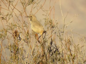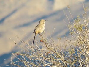 This harsh, sparse, and dry habitat dominated by saltbush and creosote is the domain of the elusive LeConte’s trasher, which is the Sasquatch of the thrashers because it is a pale, drab bird that prefers to run on the ground rather that fly and has the annoying habit of always keeping dense vegetation in between itself and the observer. In other words, it a damn hard bird to see and see well, that is until the pull of defending it’s territory kicks in. This usually starts in January and lasting through March.