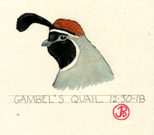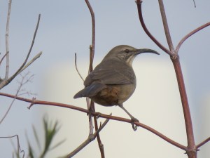 I first hear the rolling-meandering call of a thrasher at 6:41 AM and I rushed to the southwest in search of the singer. But this desert wraith led me on a wild thrasher-case that ended at a dense brush Leaving me gazing into oblivion. Then from my right, I heard another song and I rushed off to the northwest. This time I saw a pale bird with a peachy butt hop to the ground and disappear into a dense thicket. My first, but brief, sighting of this feathered ghost. . . I think.