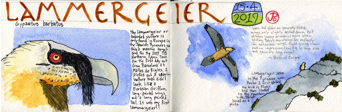 One bird stood out for me when I was flipping through the pages of Birds of Europe about eight years ago. It was the first bird featured in the Birds of Prey section which featured vultures, hawks, kites, eagles, and falcons. This showed the bird and it’s shadow as it cruised the hight mountains, another illustration showed the bird picking through the bones of a former animal as two ravens look on. This was the oddly named lammergeier (lamb vulture in German), a bird I associated with Africa or even Asia but not Europe. And the tiny smudge on the range map indicated that that they occupied a small area near the Spanish-French border and the purple color told me that this large vulture, also known as the bearded vulture, was a year round resident.