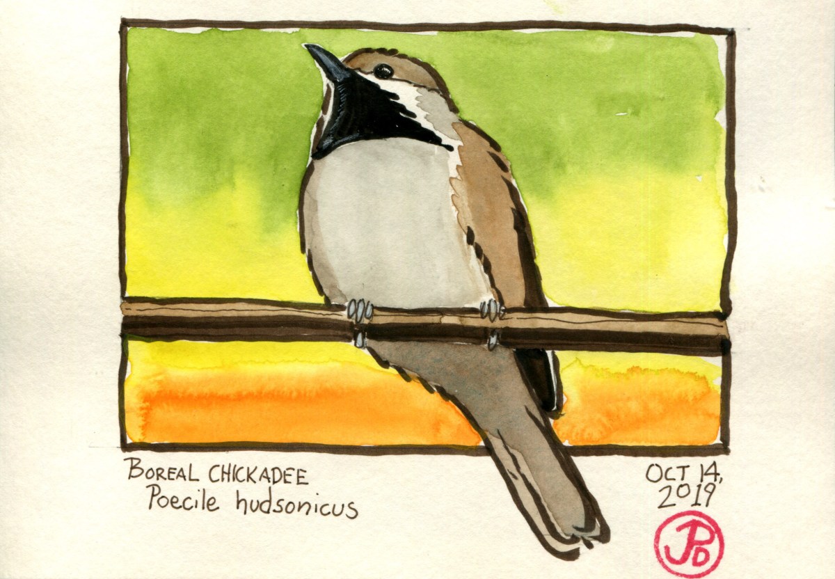 Above is the first photo that I captured of the mystery bird. The key fieldmark that distinguishes a boreal from a black-capped is that the boreal has a brown cap. The bird was looking to be the bird that I was looking for. It clearly had a brown and not black cap. The Audubon Bird Guides noted the boreal chickadee, “has gained a reputation as an excessively elusive bird.” This bird was elusive no more! Lifer!