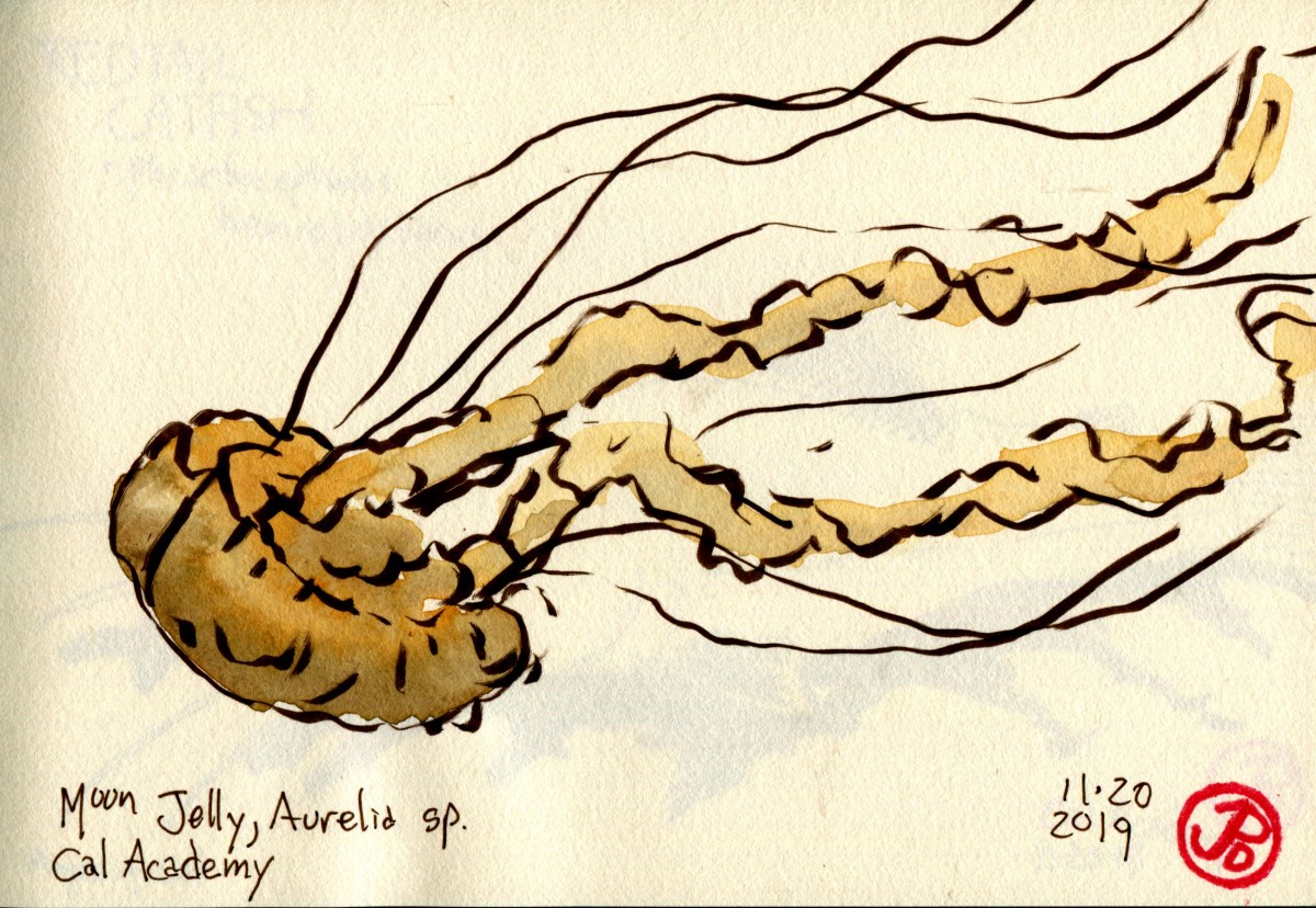 I then headed into the basement where the aquarium is located. Here I sketched a massive but stationary red-tailed catfish(all sketched in pen) in the drowned Amazonian flooded forest tank. I had a grand time sketching a moon jelly with my sepia brush pen, all without a underlying pencil drawing (featured sketch).