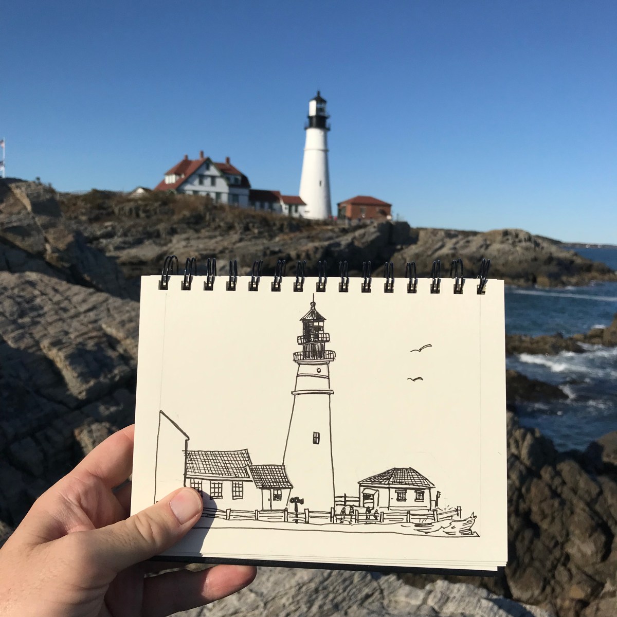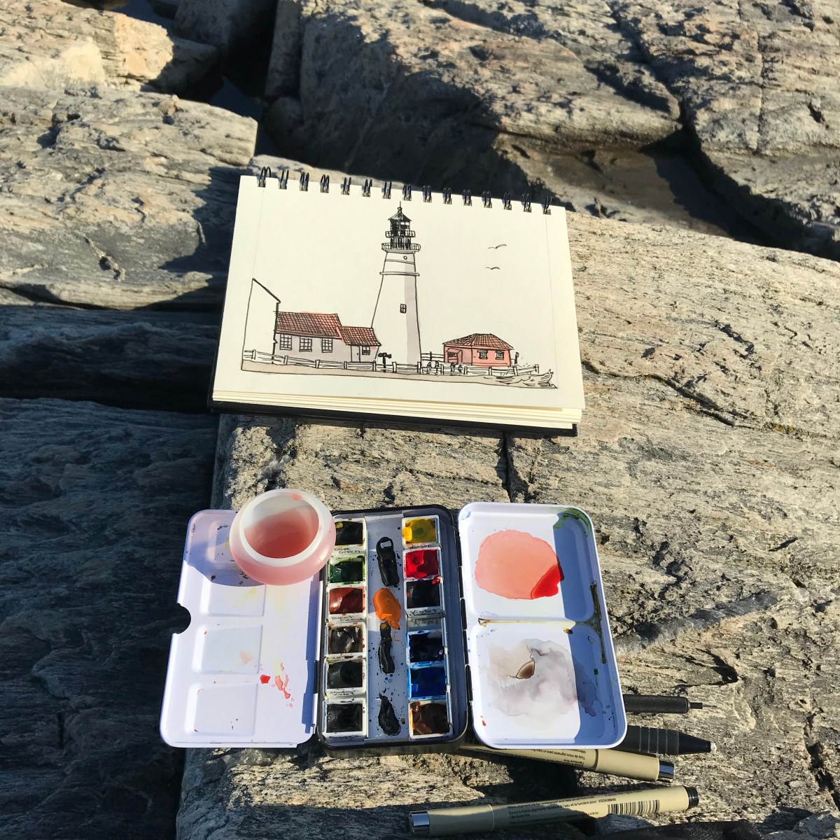 A little watercolor near the water. The rocks just north of the lighthouse provided the perfect sketcher’s seat. I had a raft of common eiders to keep me company.
