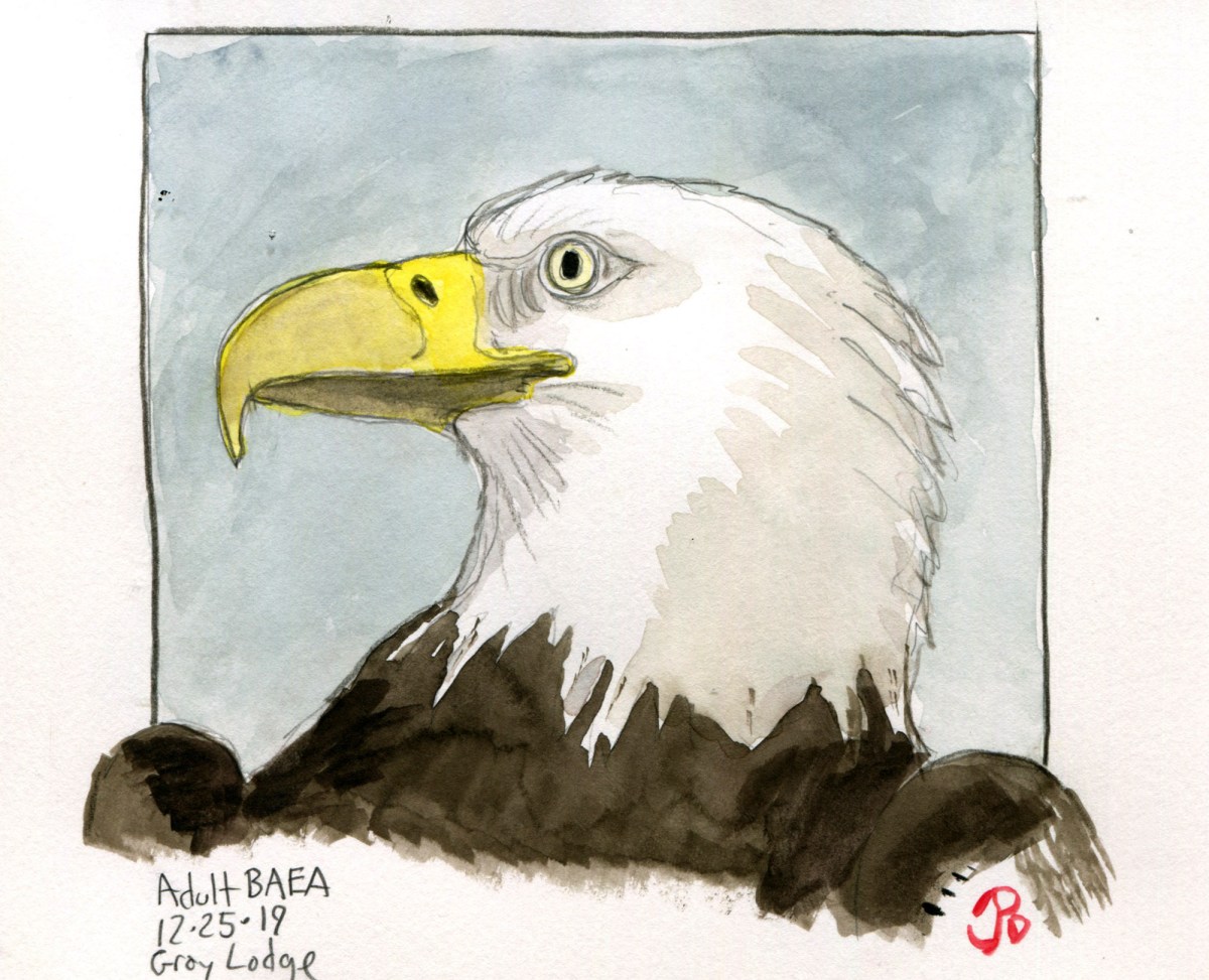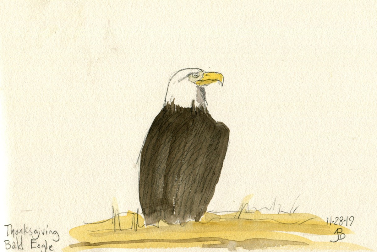 The unmistakable heft and upright posture of a bald eagle, in this a case an immature. This bird did not allow a close approach. An eagle takes five years to gain it’s iconic “outfit” that most people would recognize: white head and tail, yellow beak, and dark chocolate-brown body.