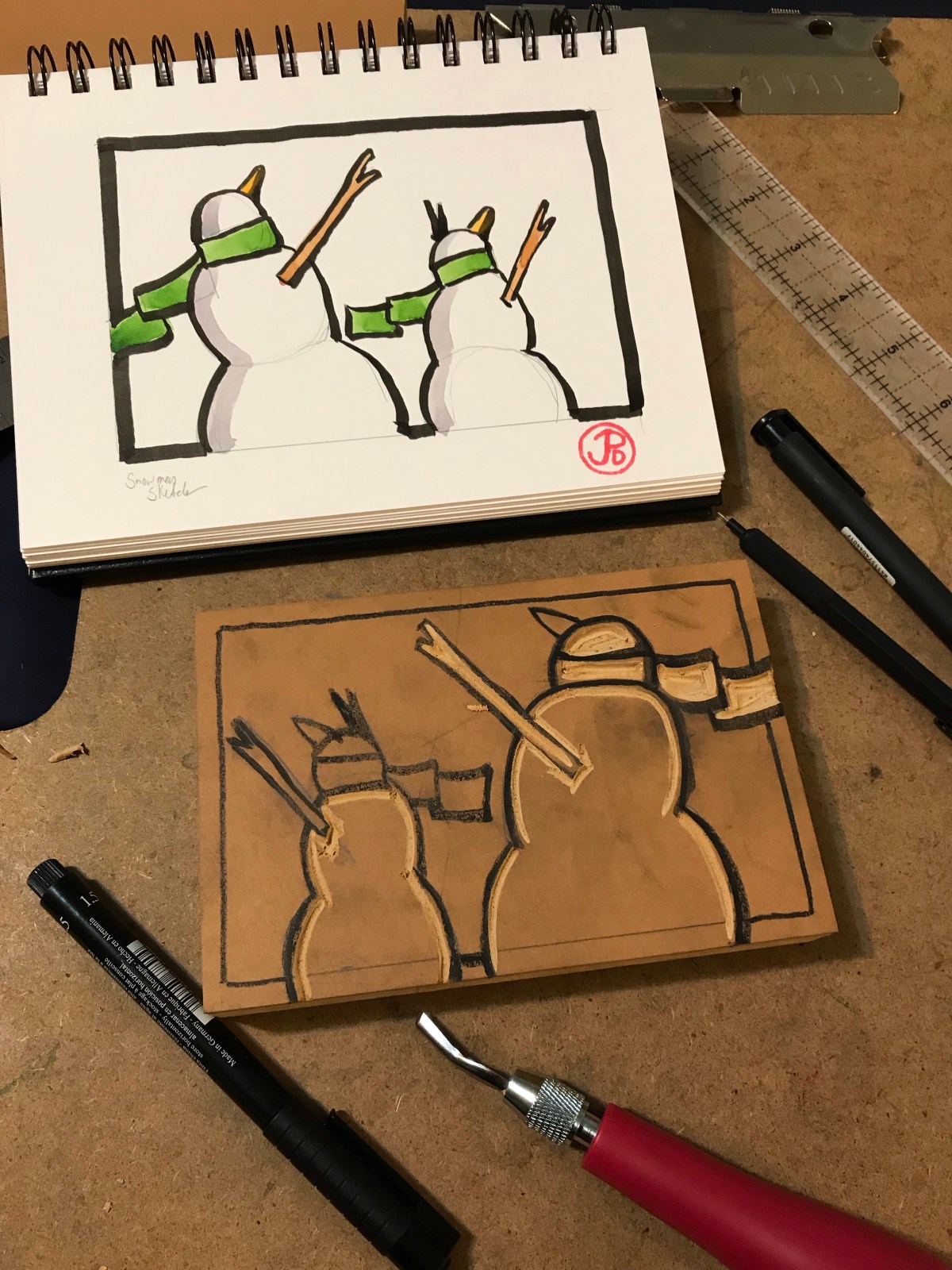 A refined draft sketch which I used to draw the design on the linoleum block, in reverse of course. Here I am just started to carve out the block.