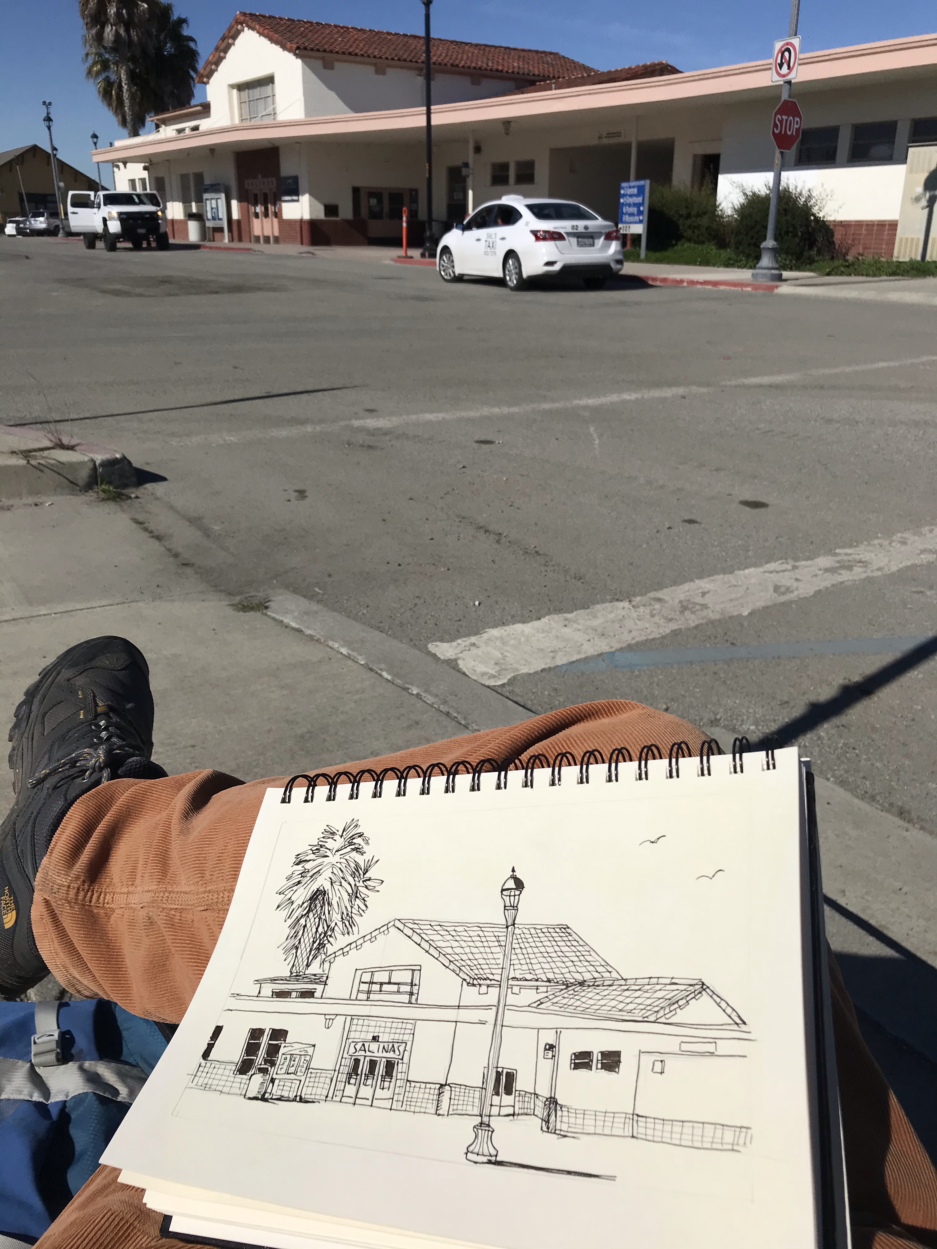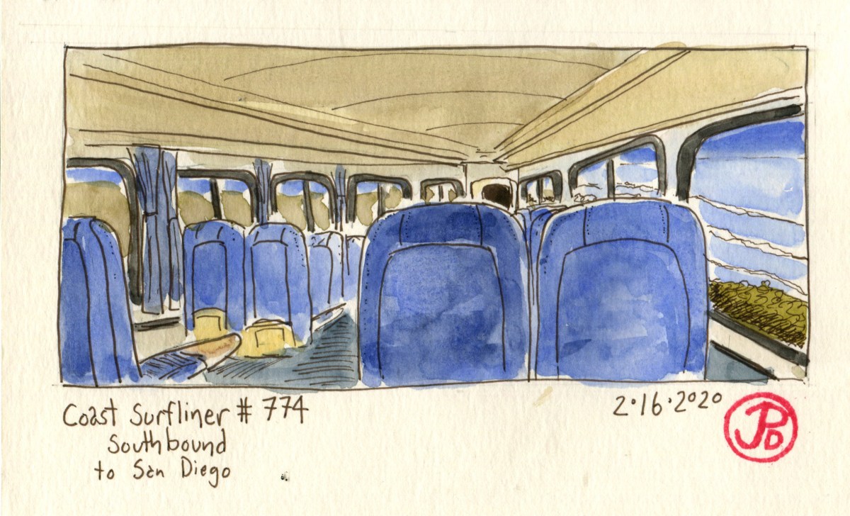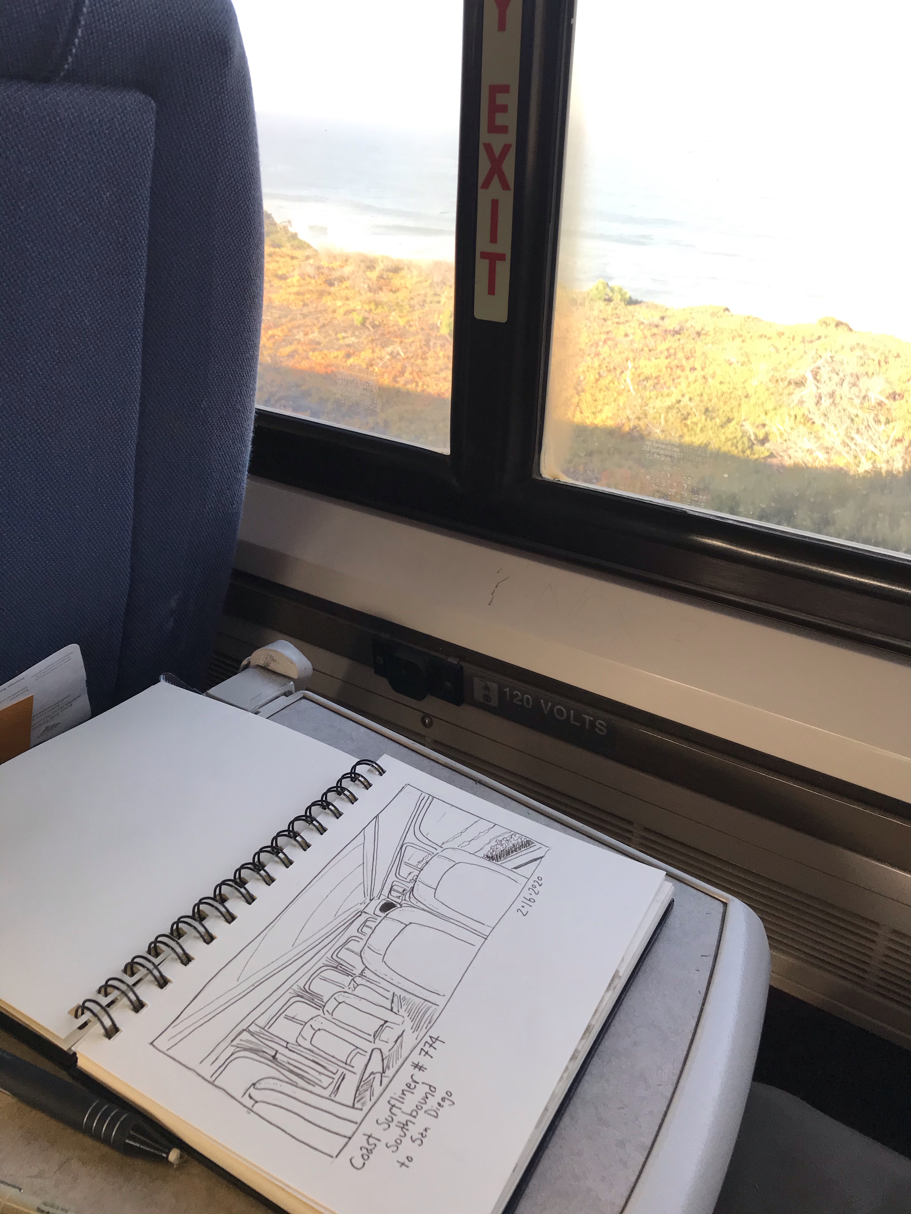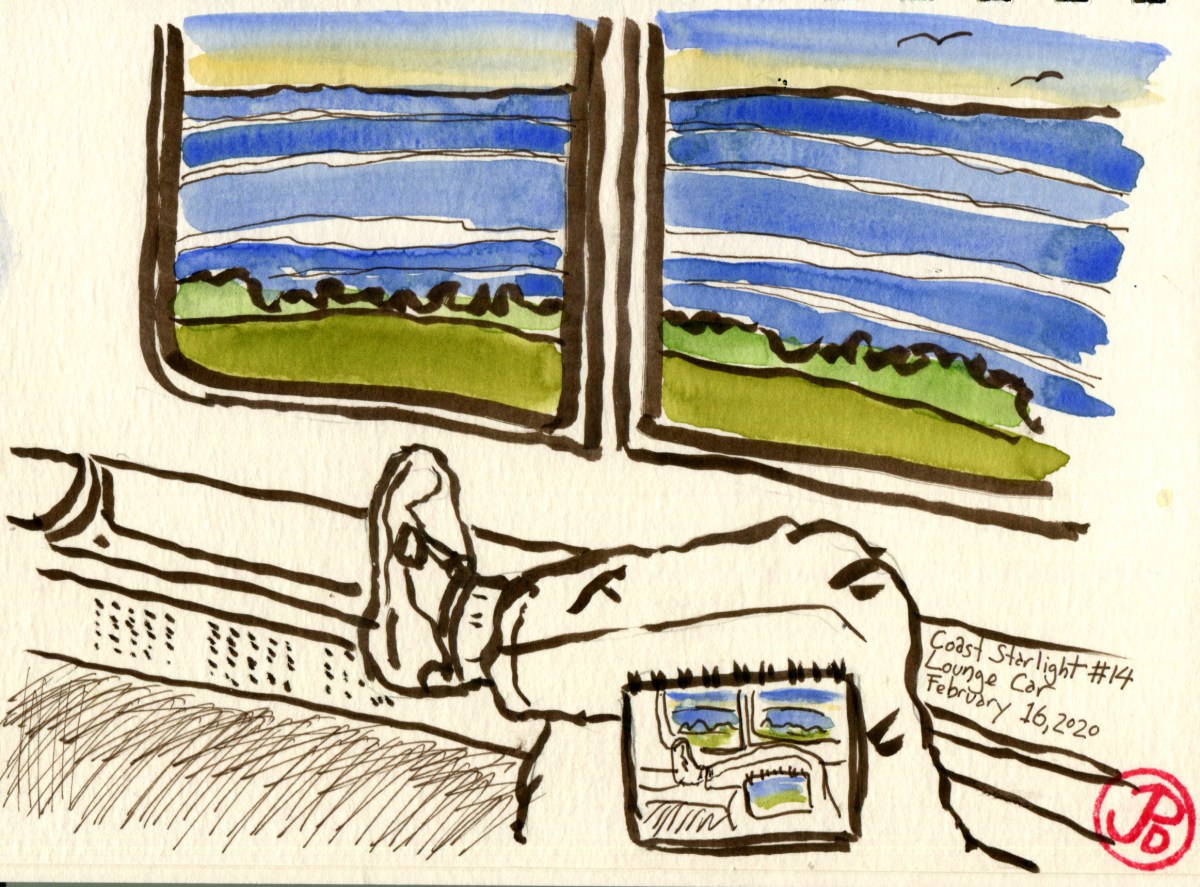 Part of the joy of train travel is the people you meet on your journey, albeit a very short journey, I met a travel writer and fellow birder in the observation car. We birded the beautiful coastal afternoon (harriers, red-tails, and turkey vultures) and talked about our travels and writing and sketching. You certainly would never have this experience driving the coastal route in a car.