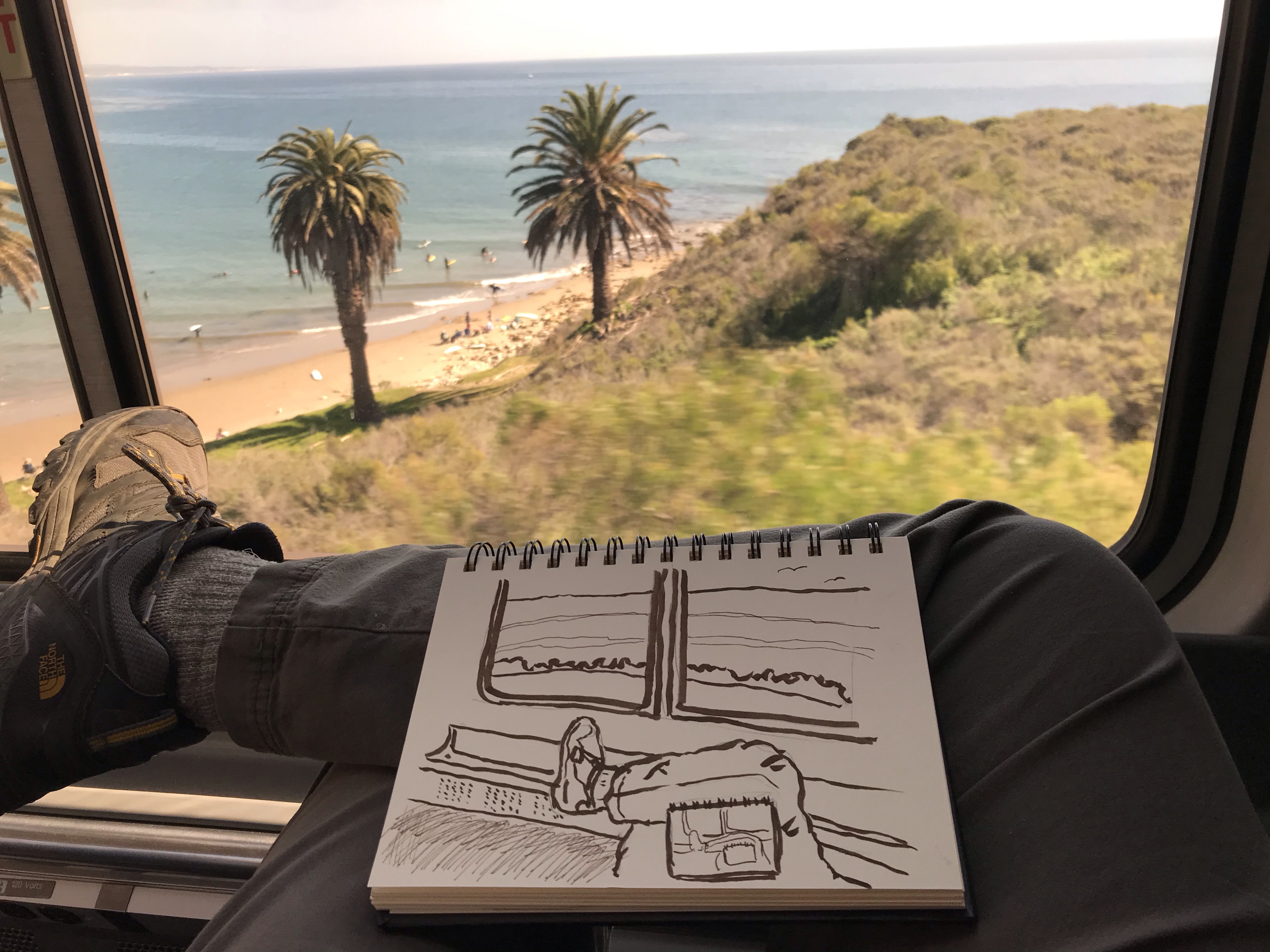 The Coast Surfliner being pushed to San Diego as it leaves Santa Barbara Station running one hour late. Overall a wonderful ride, except for the breaking down part. Now it’s time to sketch!