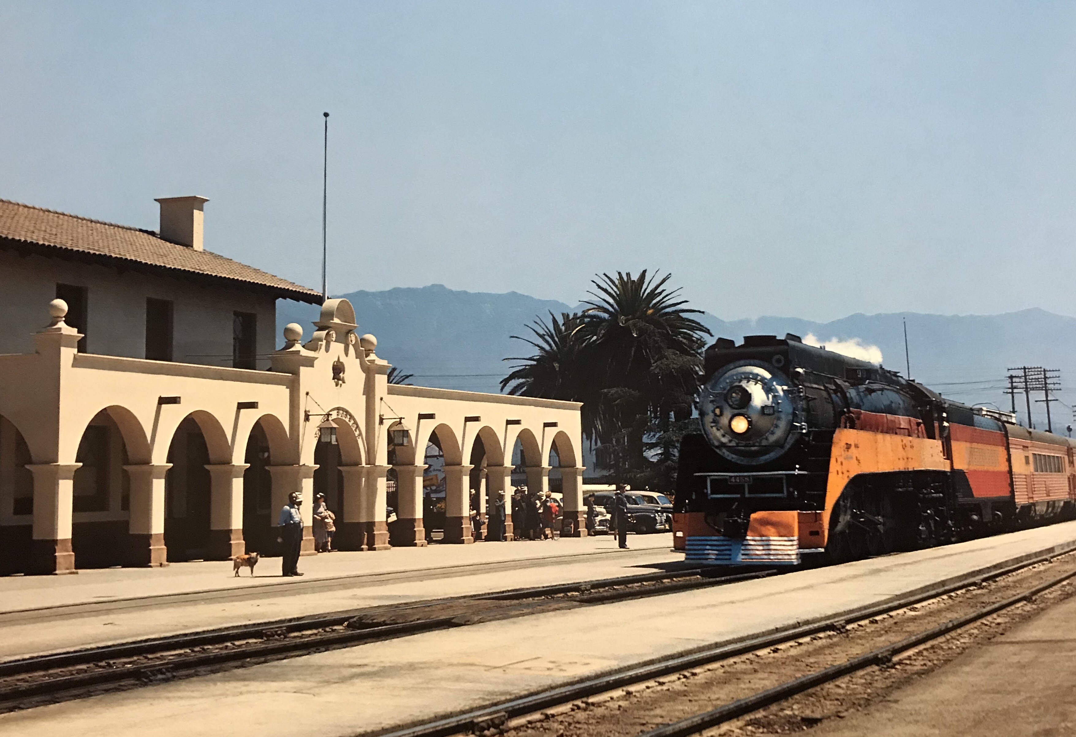 The John MacQuarrie mural at Salinas was painted in 1941 (the same year as the Palo Alto mural) and prominently features the star motive power at the time, the Golden State 2 (GS-2). Six of these locomotives were built and went into service in 1937.