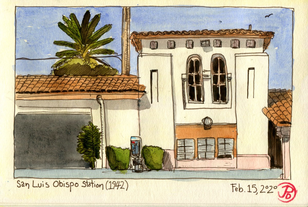The Starlight pulled into San Luis Obispo Station on time where the train stopped for about 15 minutes while passengers unloaded and loaded and the station agent divested the cars of trash and helped to load luggage.