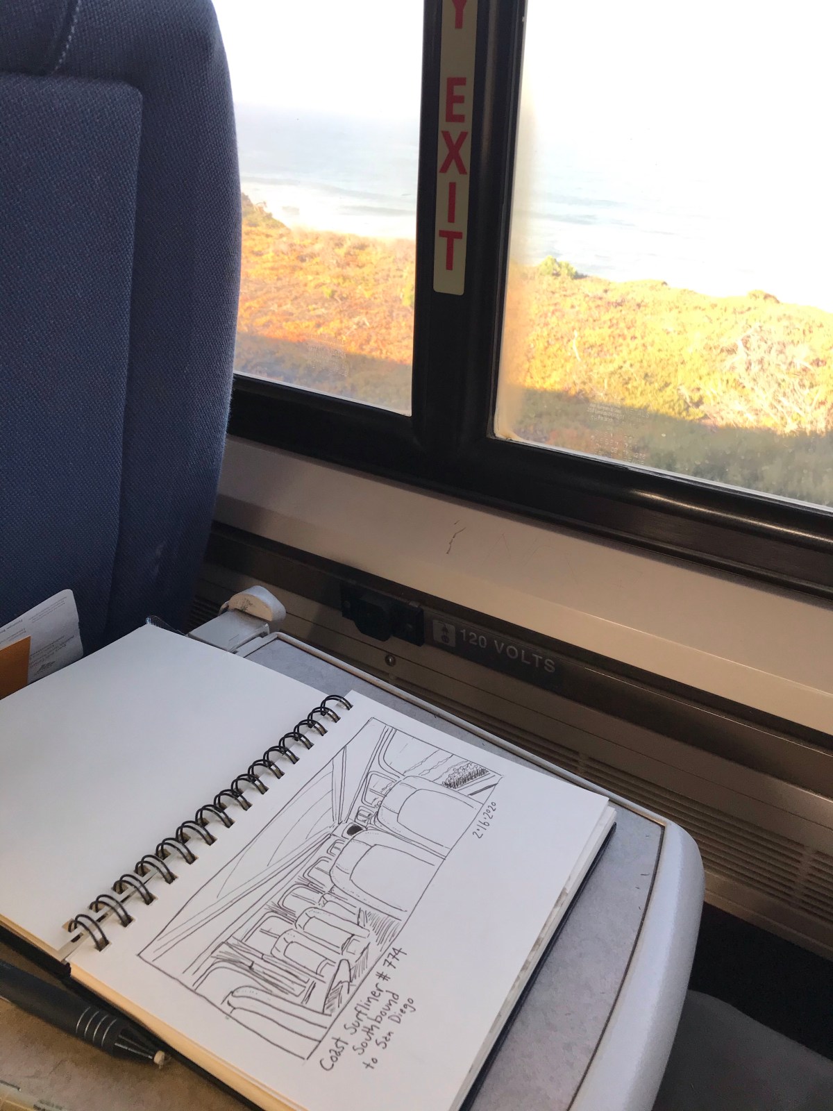 Working on the line work of the interior of the Coast Surfliner. Rail travel can be slow, especially when the train breaks down. All the better to bring along a sketchbook and pencil case. One can never be bored when sketching! (Although I knew I would have less time with my Santa Barbara Station sketch. )