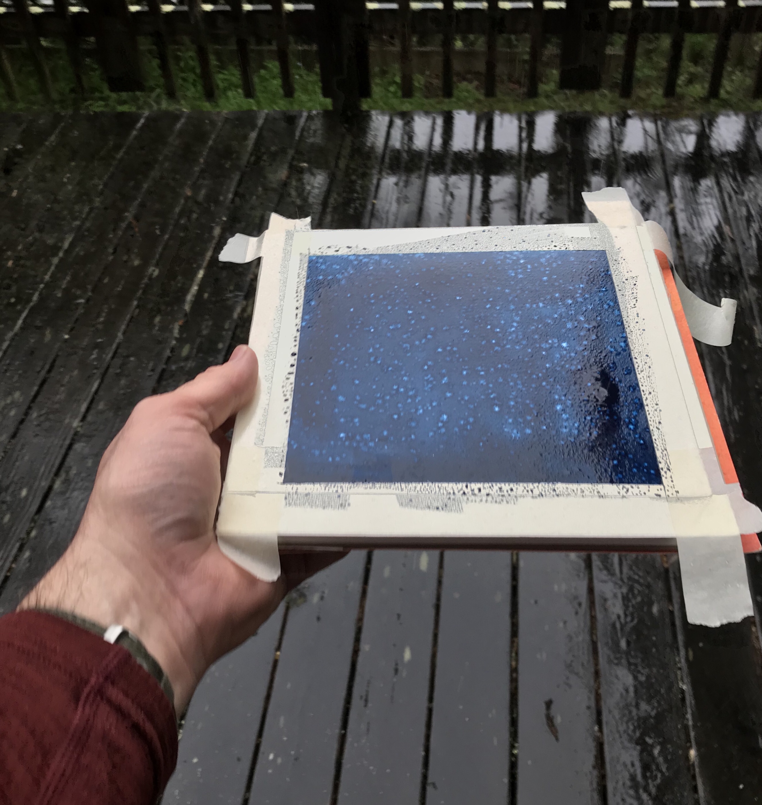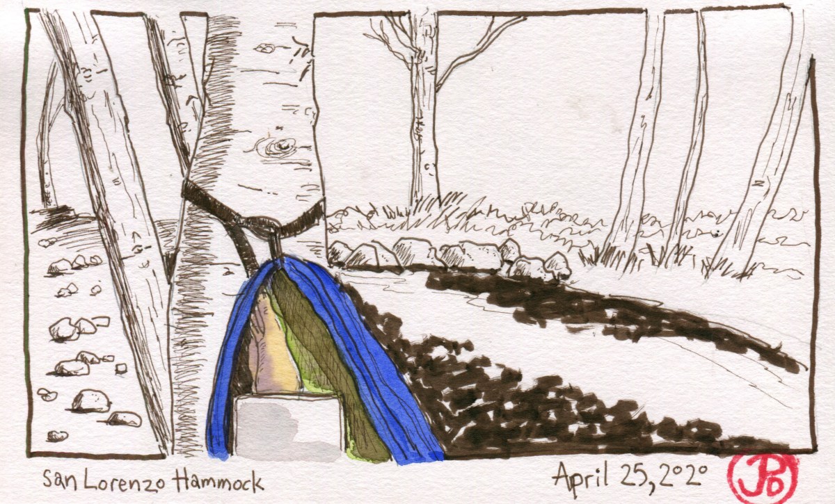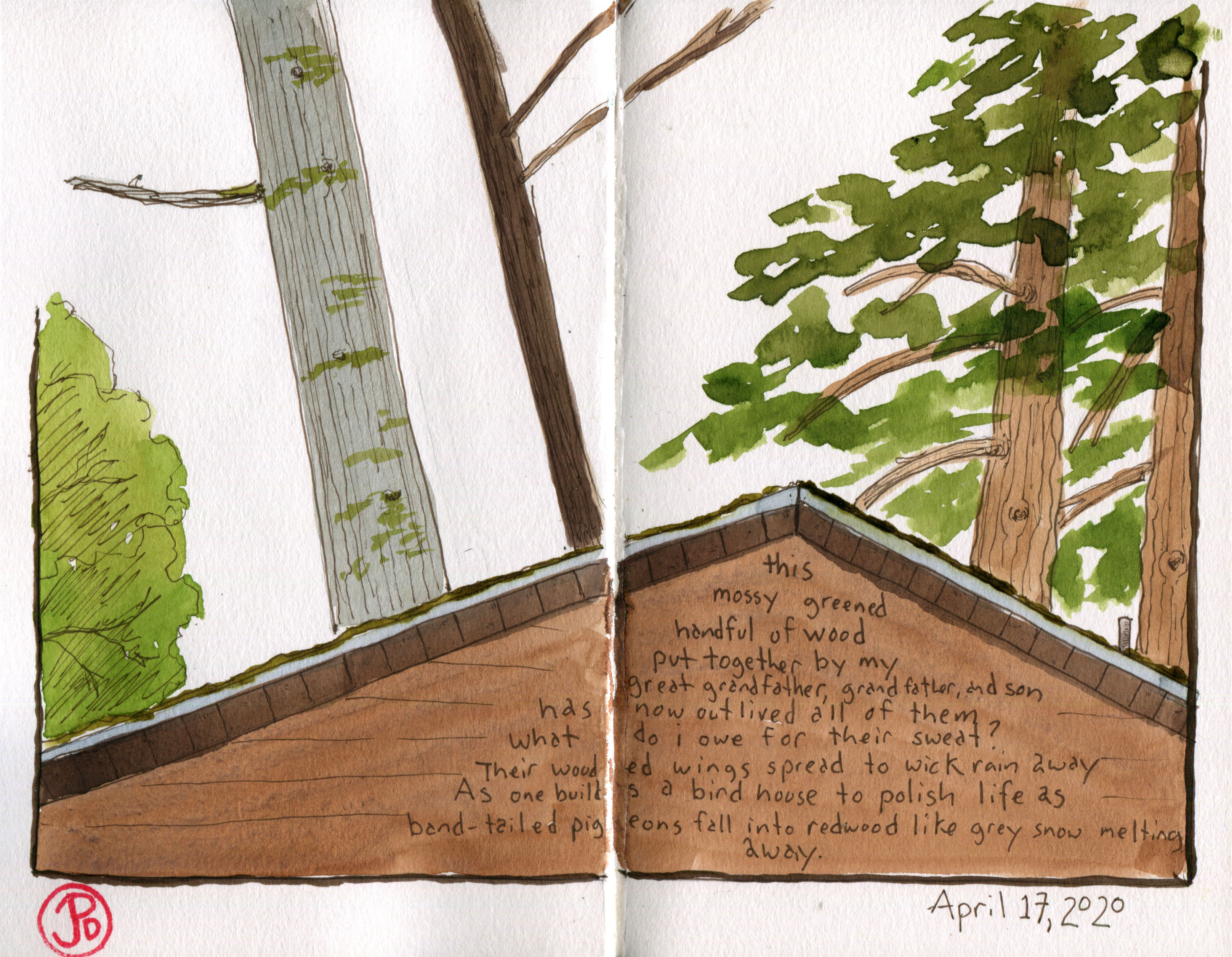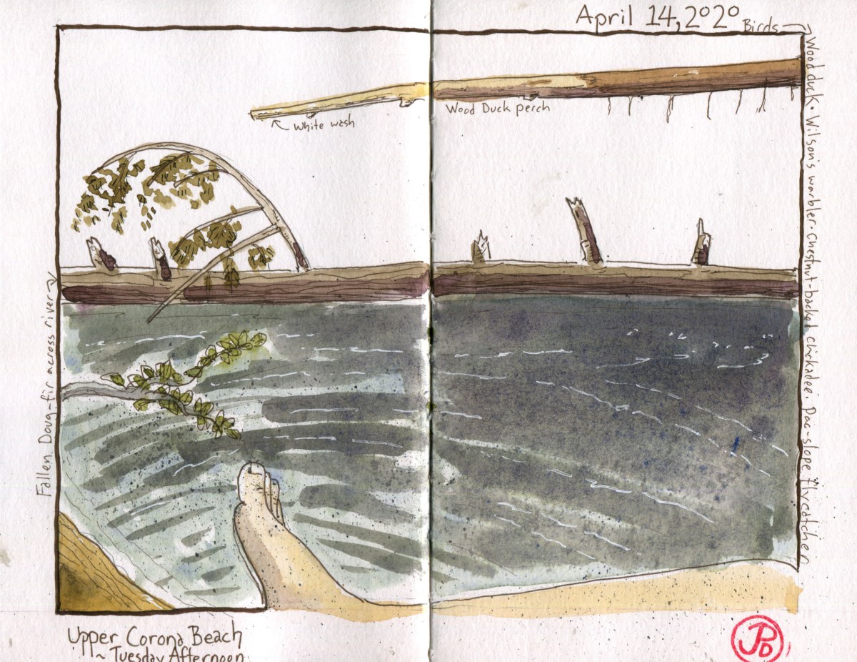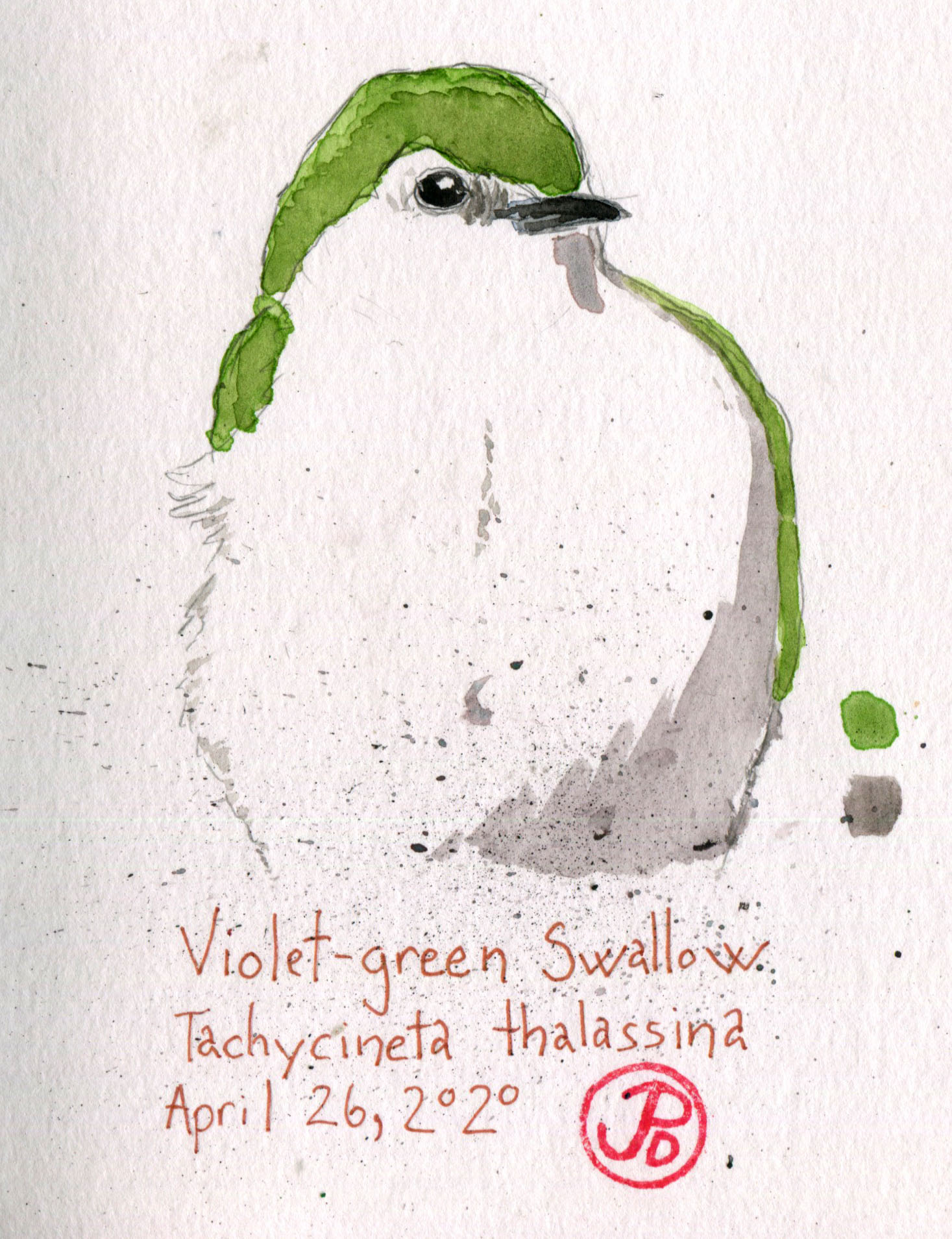 Now came the really messy part: I stuffed the holes with suet. Suet is like the blood on Lady Macbeth’s hand, impossible to wash off. “Out, damned suet! out, I say!” Once I had plugged the holes with bird candy, I hung it up and now it was a matter of waiting. Which would be the first customer? My heart said, “Chestnut-backed chickadee” but my head said, “Steller’s jay”.