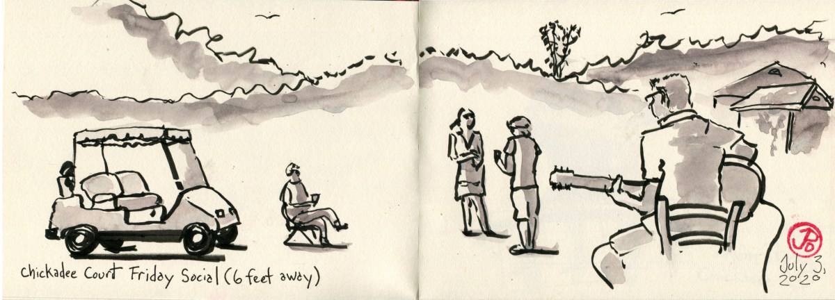 I took this time to sit across from the rest to get a sketch in while a neighbor from another street played guitar. I decided that I was not going to sketch everything in front of me. Instead, I selectively sketched, creating little snapshots of the scene. I did not use a pencil under sketch but sketched with my brush pen and added shadow with Daniel Smith Shadow Violet watercolor.
