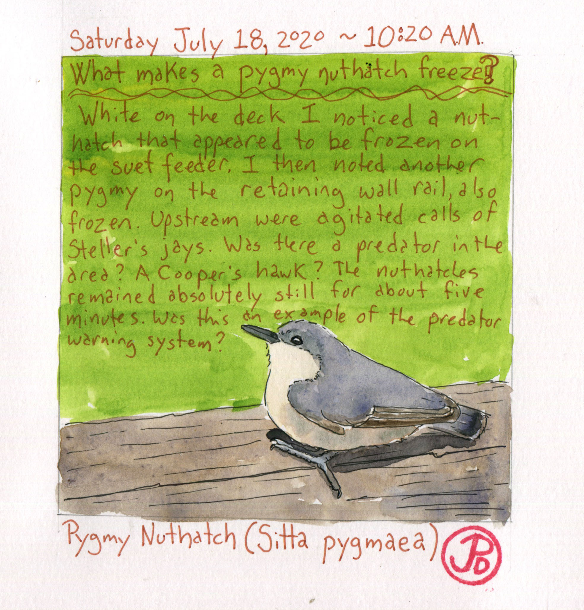 A few days before I noticed two frozen pygmy nuthatches on and near the suet feeder. Upriver I heard the masses mobbing calls of the Steller’s jay. This seem to be a warning that there was a predator in the area. I wondered what makes a pygmy nuthatch freeze? Was this a response to a predator in the area, just to hold absolutely still.