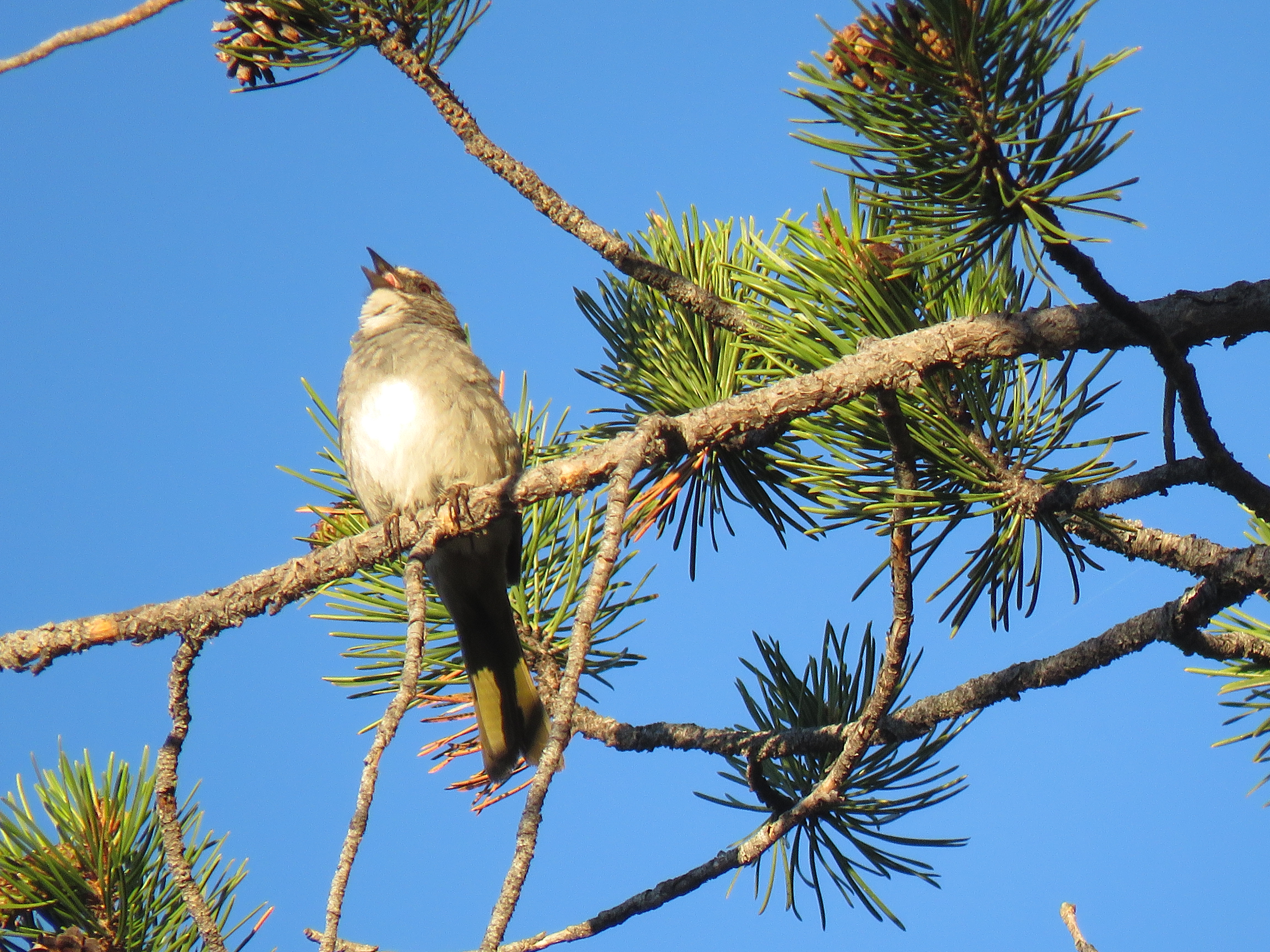 Within the first hundred yards of the walk we heard a singing bird from a pine about 30 feet up. Grasshopper identified it as one of our target birds, the dapper green-tailed towhee!