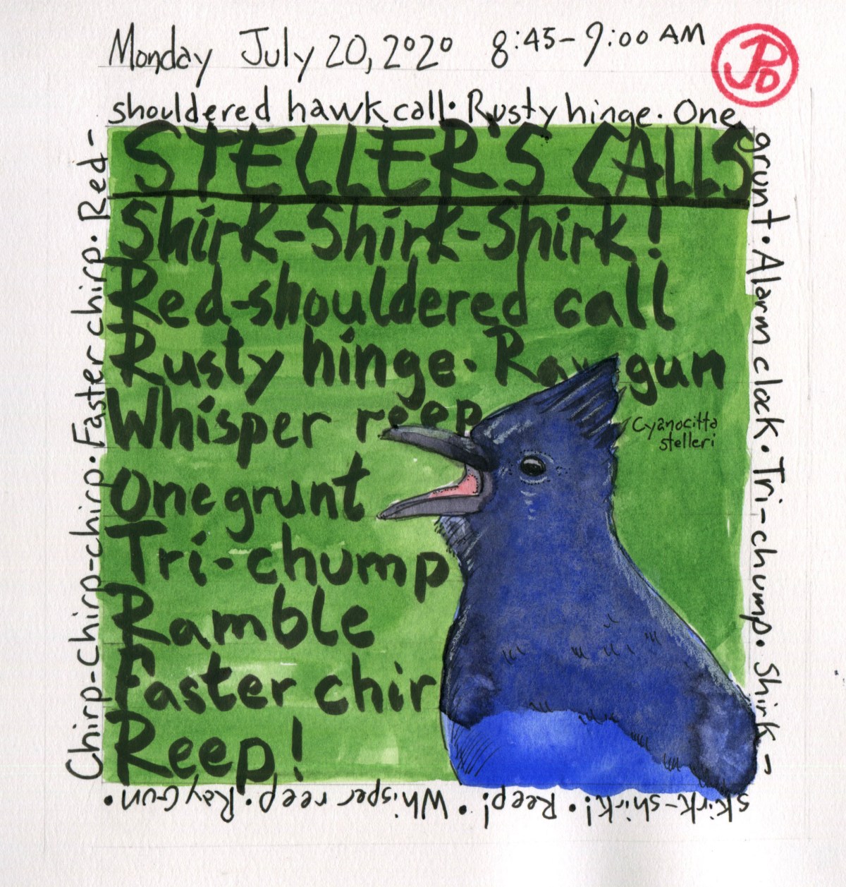 One morning, when the Steller’s jays were thick around the trees near the suet feeder, I decided to log the different sounds the jays made during a 15 minute interval. I tried to give a name or a onomatopoeia facsimile of the sounds I was hearing. Purely a subjective and unscientific exercise but a fun one at that!