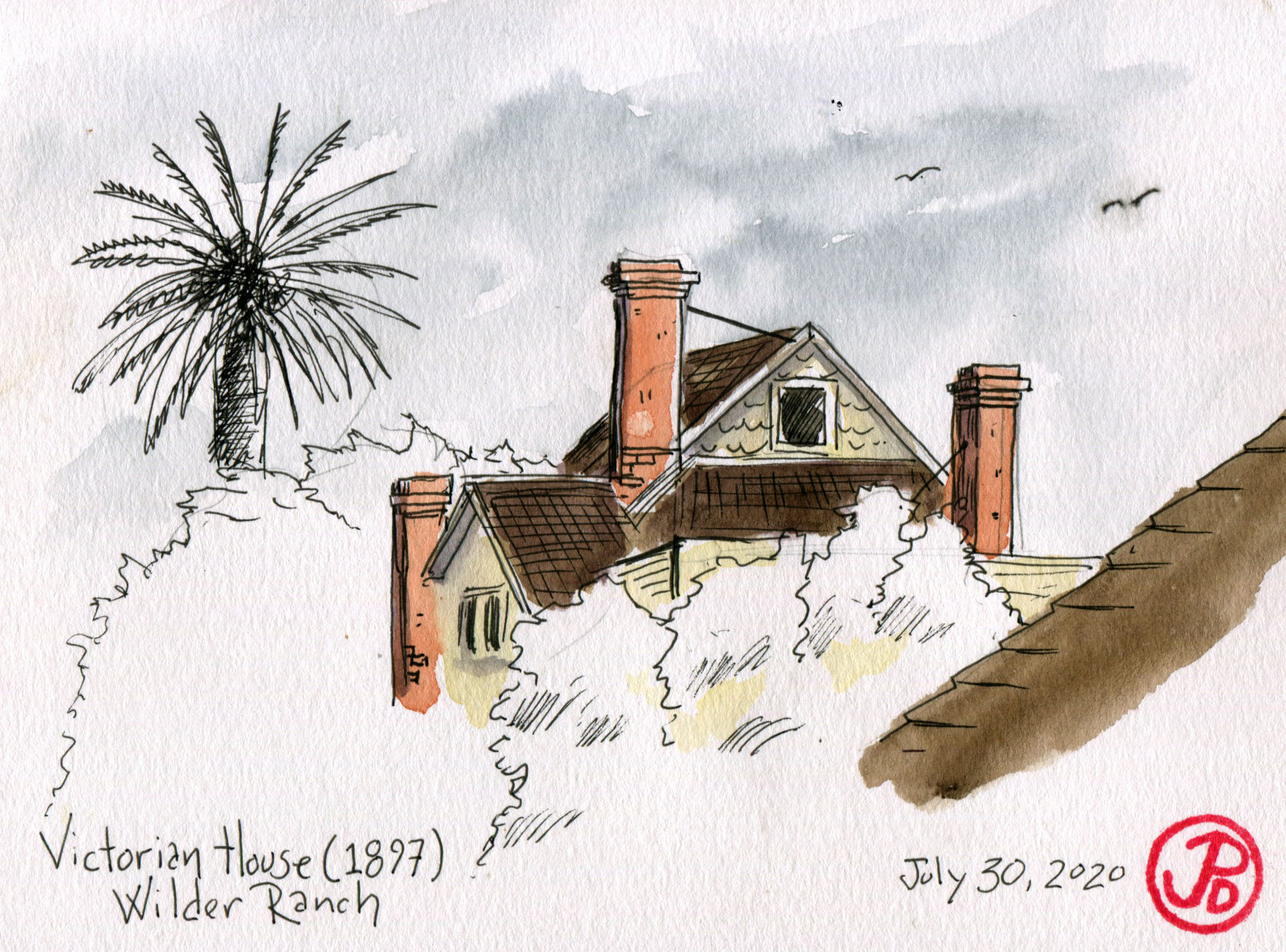 After I finished sketching the horse barn, I walked a few hundred yards to get a vantage point of the Victorian farm house with the palm tree in the background. For this sketch I keep things a little loose, urban sketching style. For example I kept the sketch of the vegetation loose, and focused on the details and perspective of the house. I carried this over to the watercolor, I only painted the farmhouse and the roof in the foreground.
