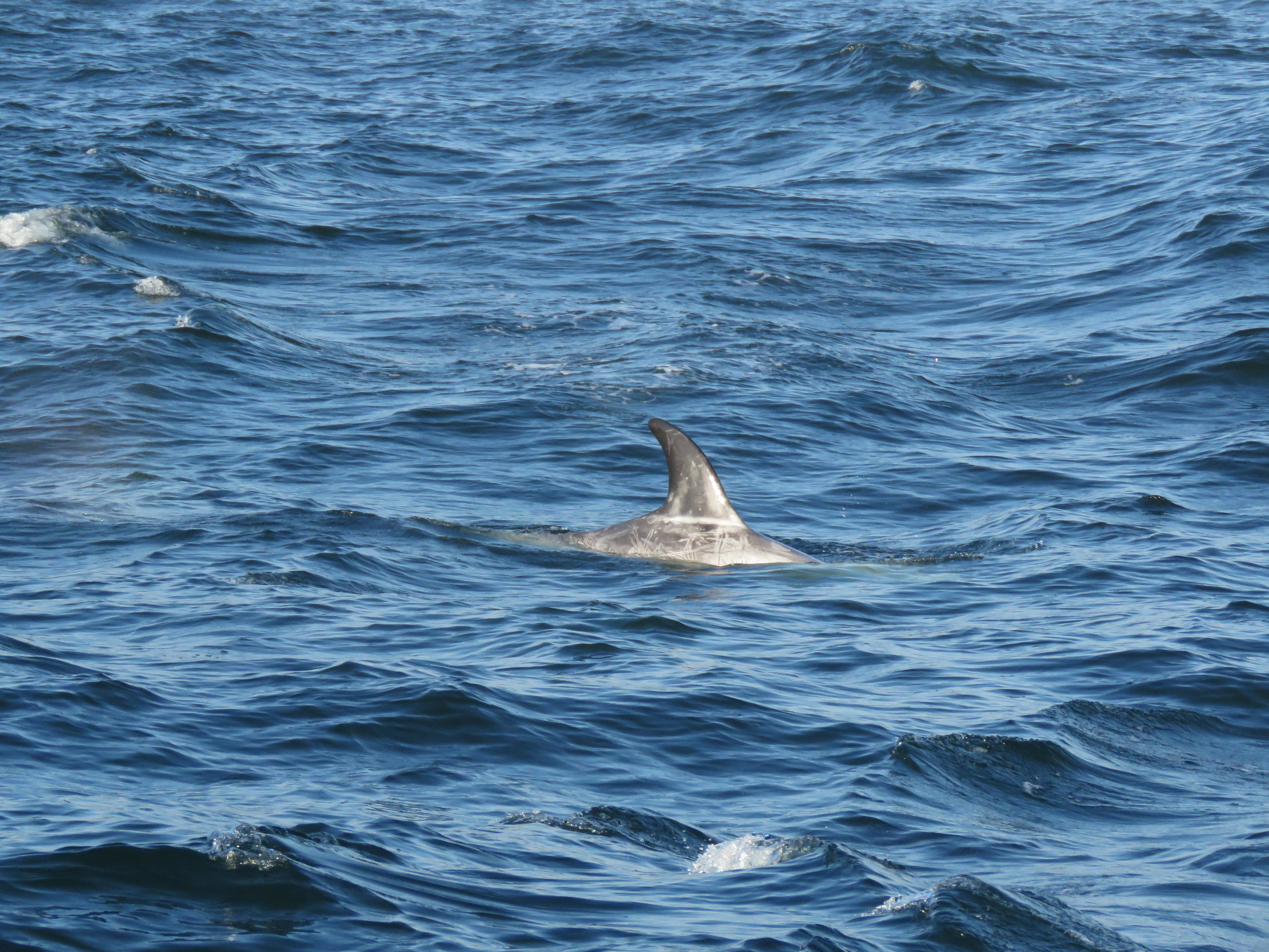 A little further out, we were upon a pod of Risso’s dolphins. These gray dolphins have dorsal fins that resemble female orcas. Our captain called attention to one individual Risso’s, an albino, named by whale watchers as “Casper”.