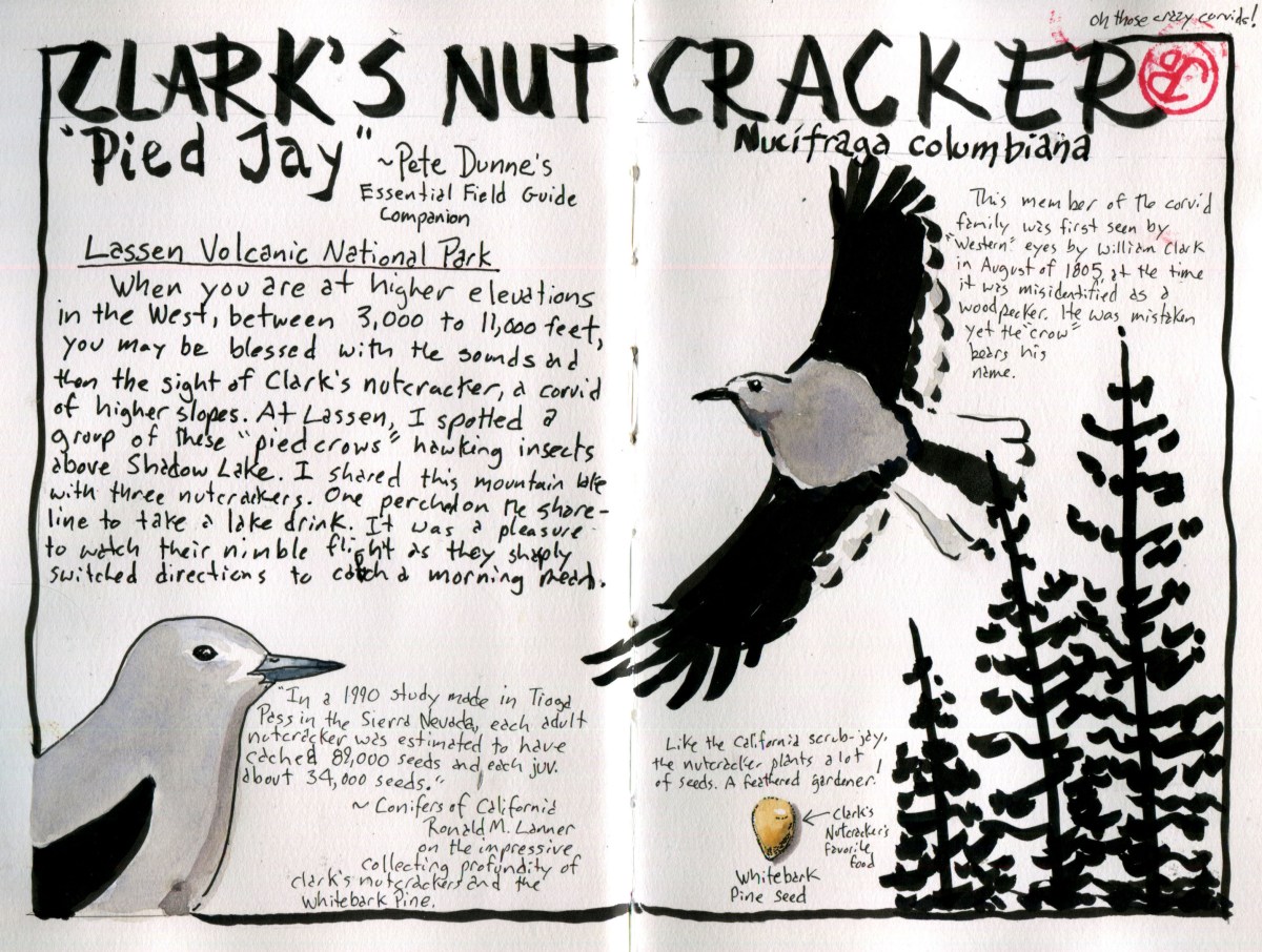 This was the case as I heading up the trail to Bumpass Hell on my first hike in Lassen. Off to my right, over a deep ravine, I heard the raucous call of the Clark’s nutcracker. A pair of these pied crows crossed over the trail and alighted on a rocky cliff. They stayed in sight for a few minutes and then crested the rise and dropped over the hill.