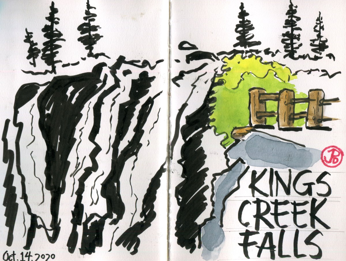 I could hear the roar of the waterfall before I saw it. In 2015, improvements were made to the Overlook area. I assume the building of a fence (featured in the sketch to the right) was to allow visitors to safely get a view of the falls without falling over the edge!