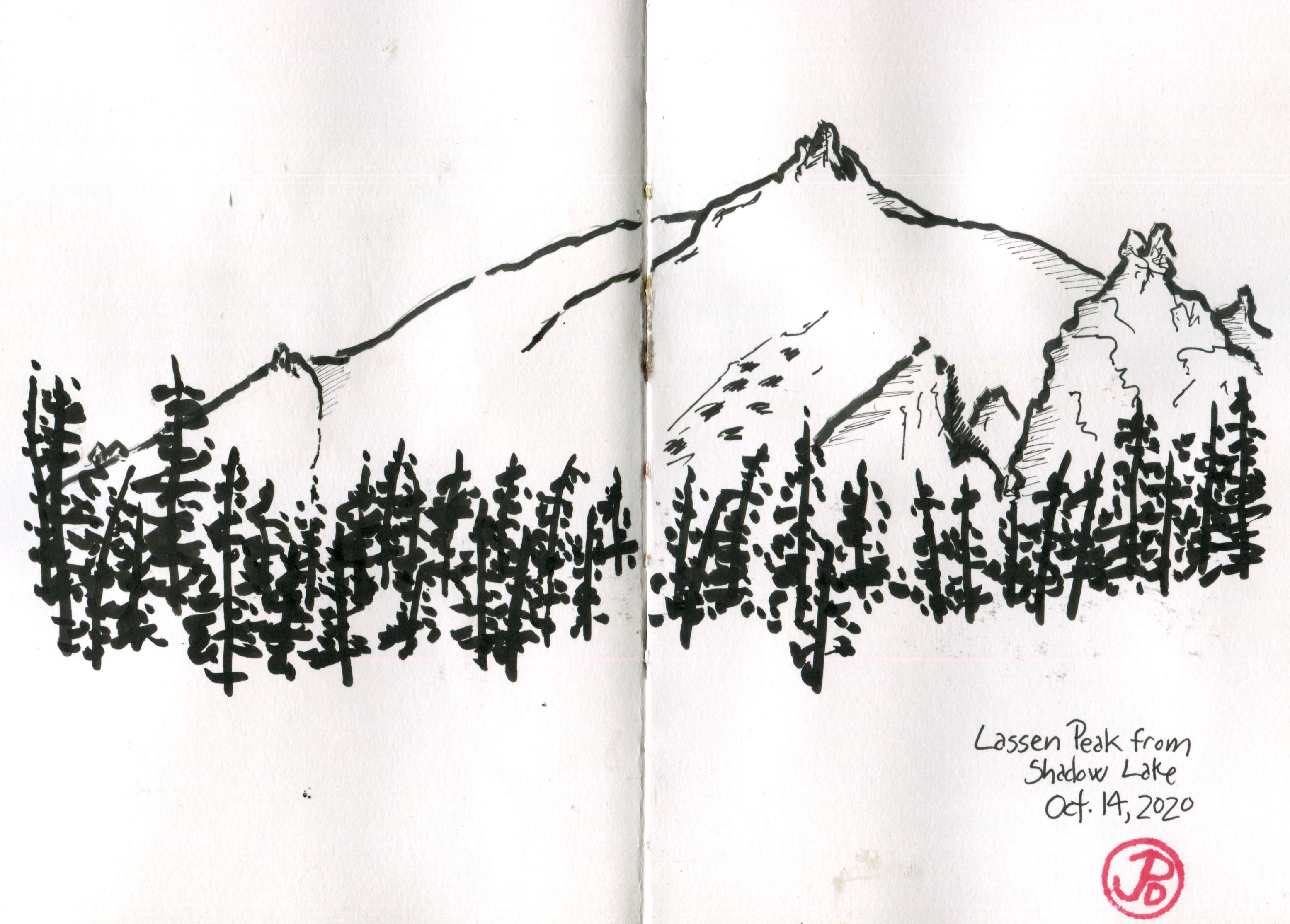 After six months of shelter in place and distance-learning, the solitude and stillness of Shadow Lake was exactly what I needed. No technology, no screens, just pen and paper and a perspective to recreate. I sketched the peak of Lassen.