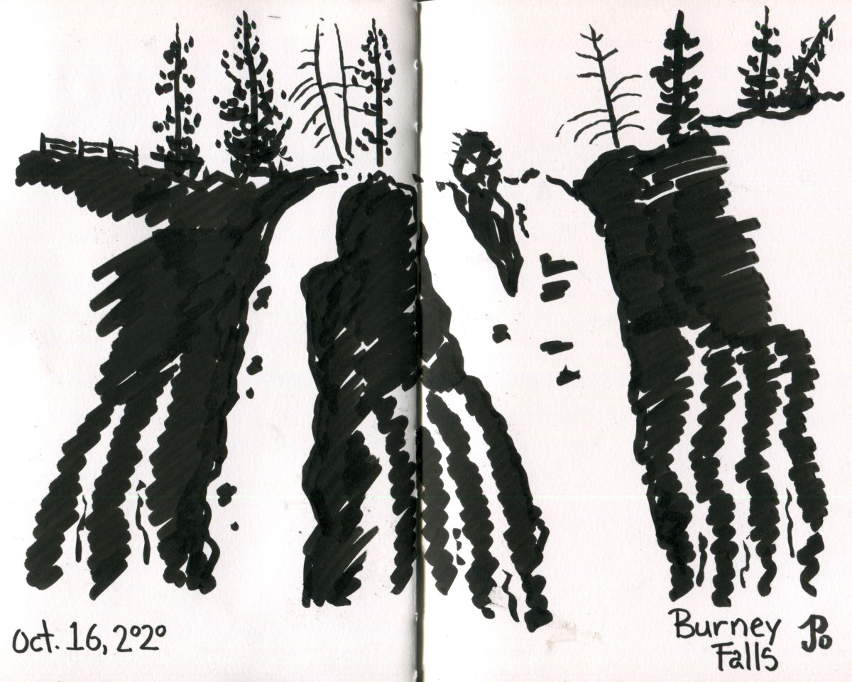 After I visited and sketched the cinematic Lake Britton Railroad Bridge I returned on Highway 89 and on an impulse, I turned right into McArthur-Burney Falls State Park. When I found out that the “hike” to the falls was only a quarter mile, I happily paid my ten bucks and proceeded to the parking lot! (I was not so concerned about the length of the hike but about timing because I was going to meet my mom and Steve for dinner in Penn Valley).