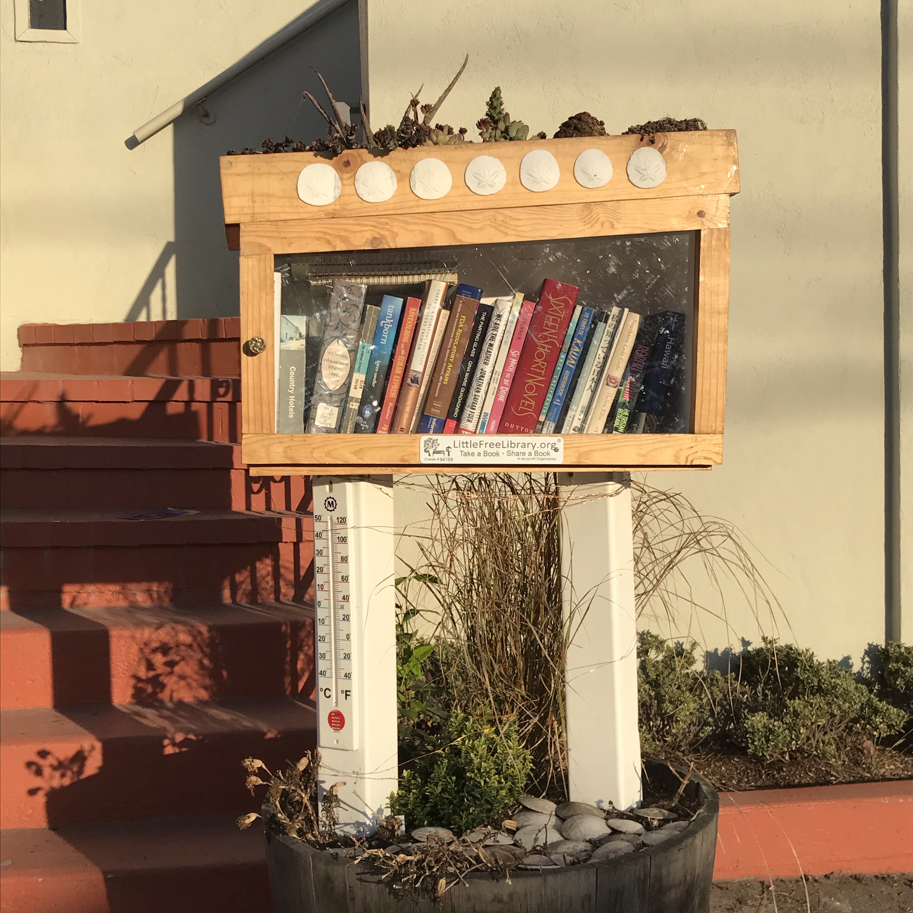 Here’s a two story version on Judah street in front of the St. Paul’s Presbyterian Church and the Far Out West Dune Community Garden.This Little Free Library is a few blocks from Ocean Beach and is topped with succulents and bejeweled with sand dollars. Each of the boxes are as uniques as their owners.