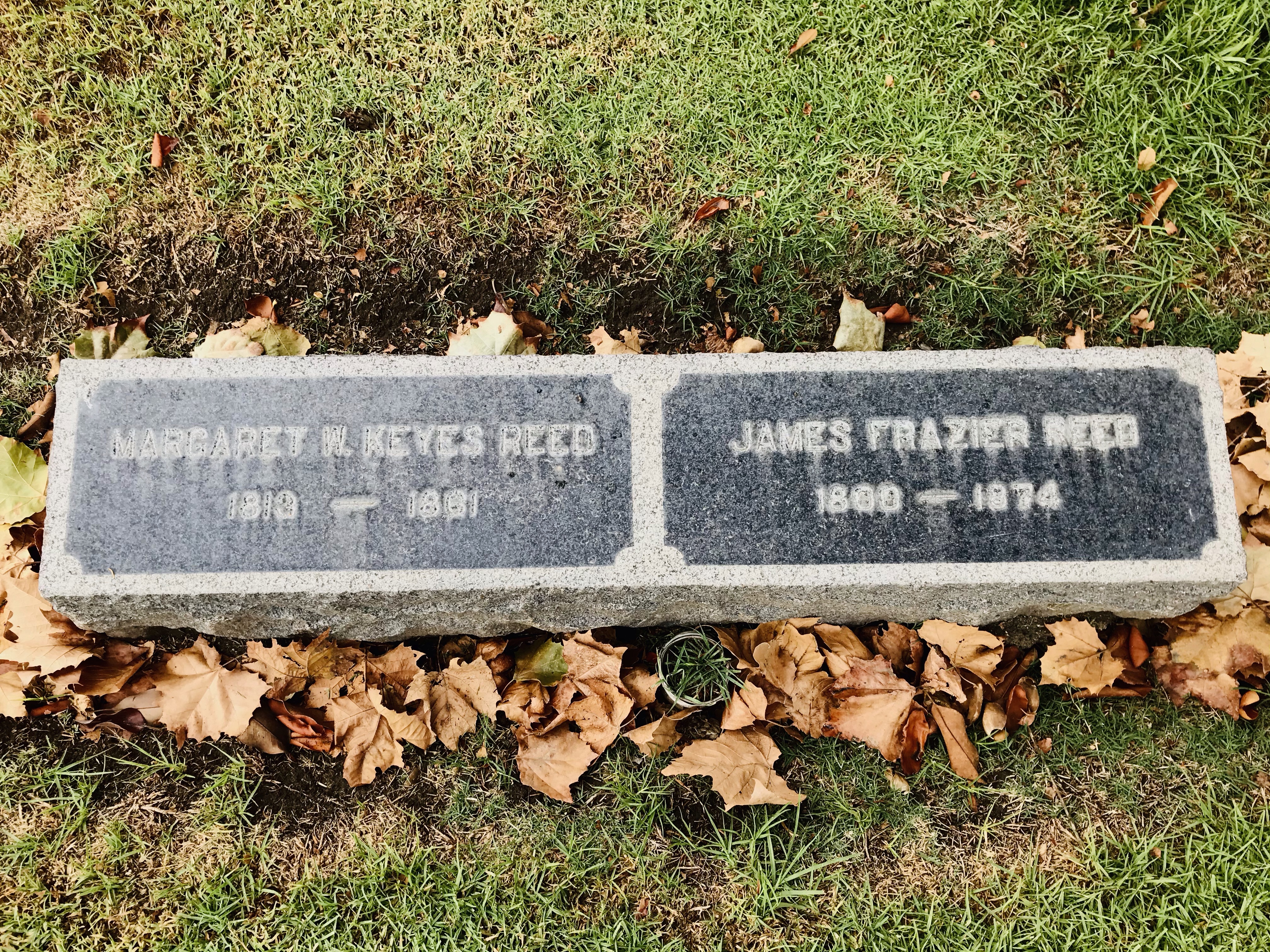 Near the core of the old cemetery is the plot of the Reed and Lewis families in Section D which is now named the “Pioneer” section. Here lies the patriarch of the family James F. Reed and his wife Margaret.